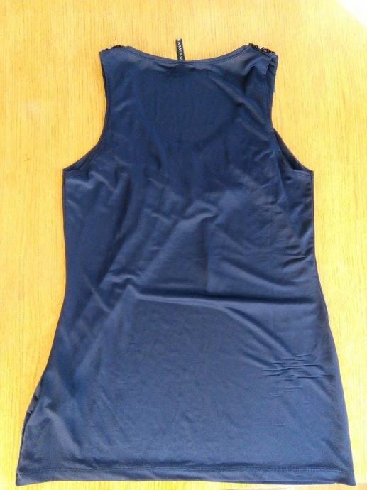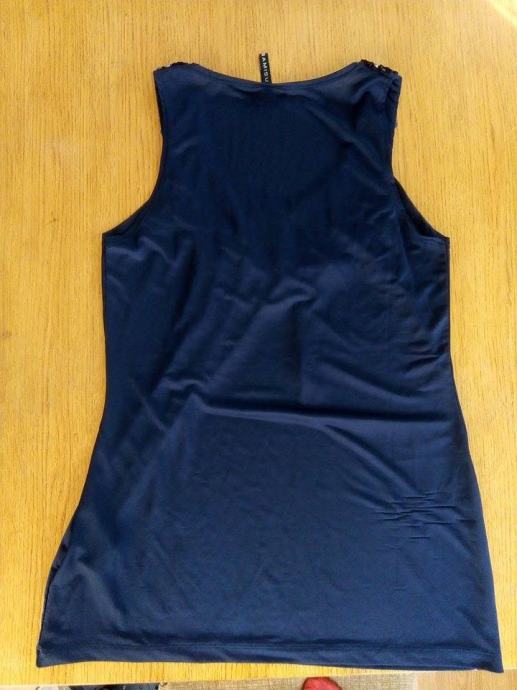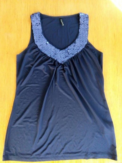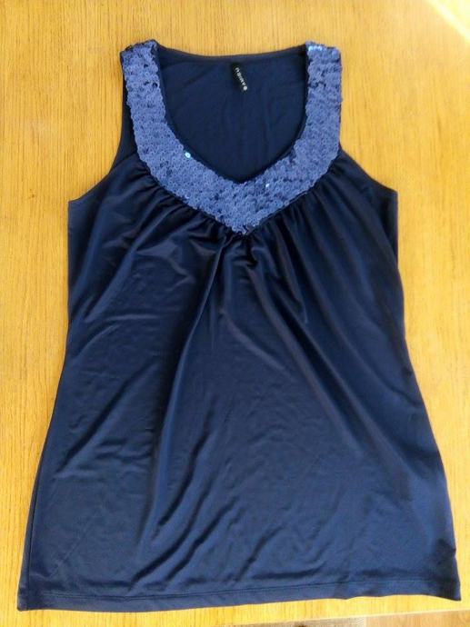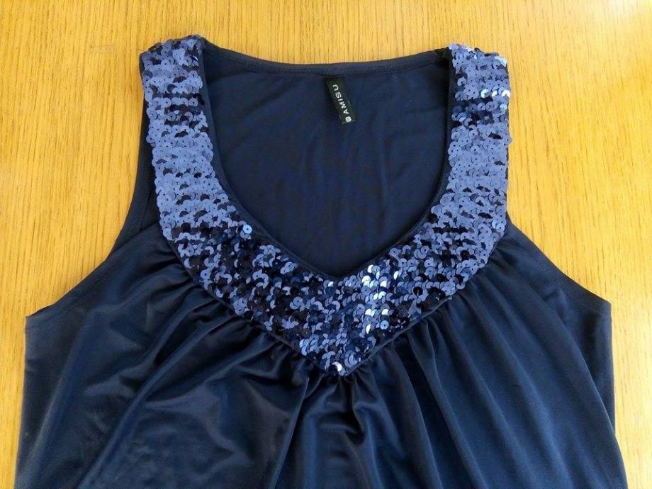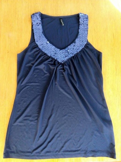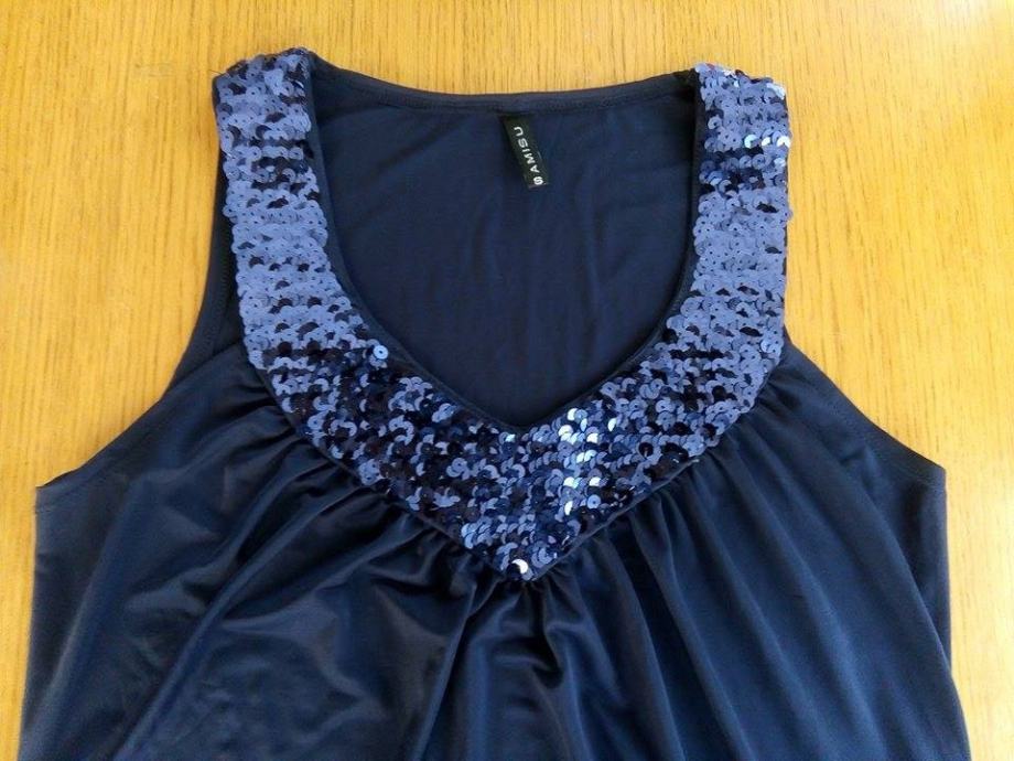 Tamno plava majica sa šljokicama, veličina S, marka Amisu, nova, jako lijepo pada, skroz rastezljiva. Bez rukava, V izrez.