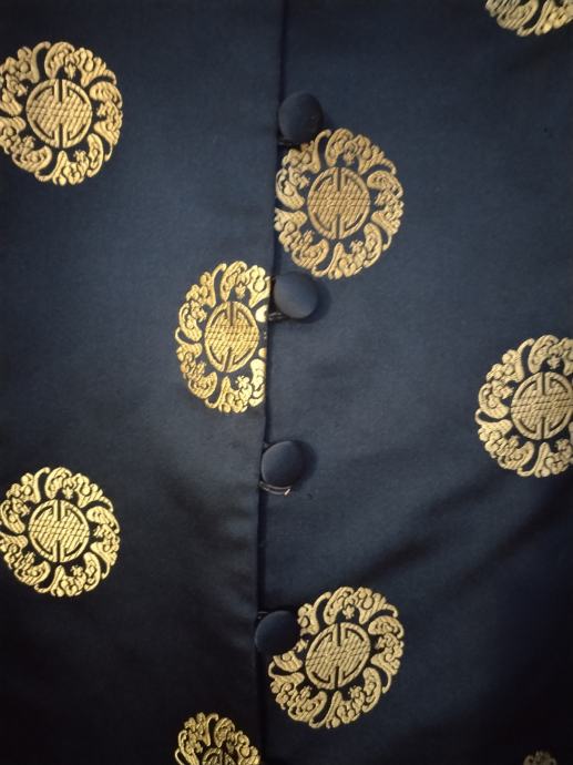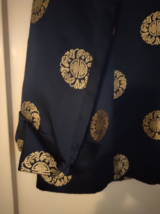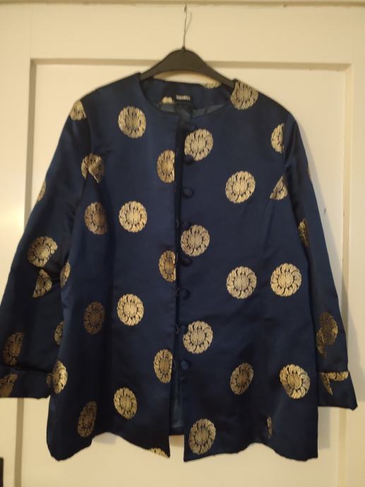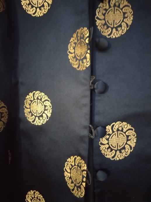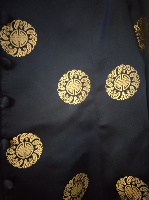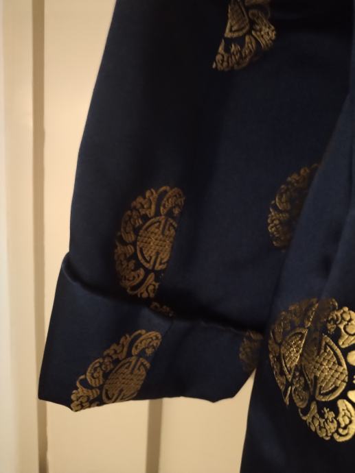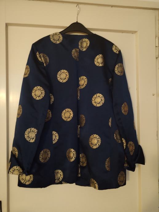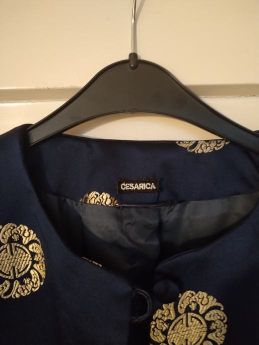 Prodajem tuniku CESARICA posebnog desena pogodne za svećane prigode. Sliči kimonu, tamnoplave boje je sa zlatnim detaljima prema slikama. Kopča se sprijeda gumbima i ima manđete, koje mogu produljiti rukave, prema potrebi.Vrlo malo nošeno pa izgleda kao novo. Ne piše broj pa dajem mjere, kako slijedi: