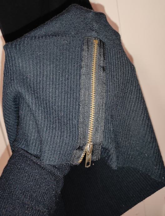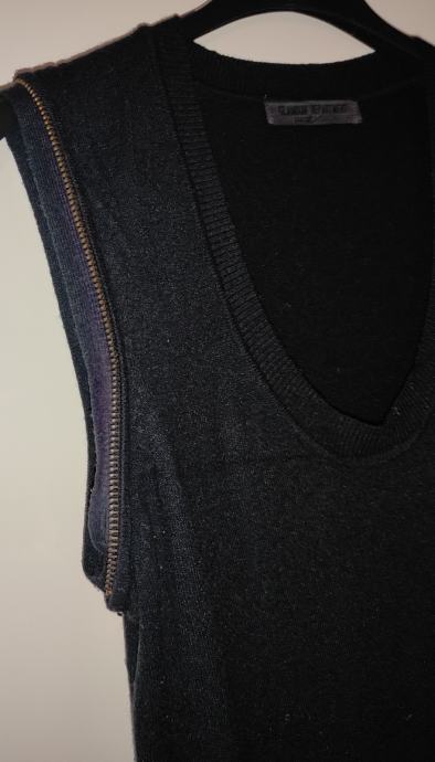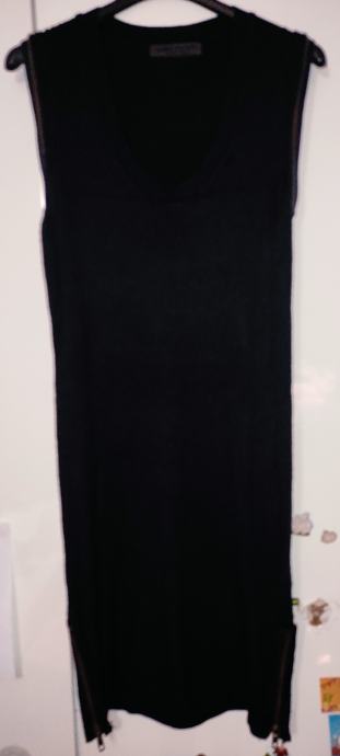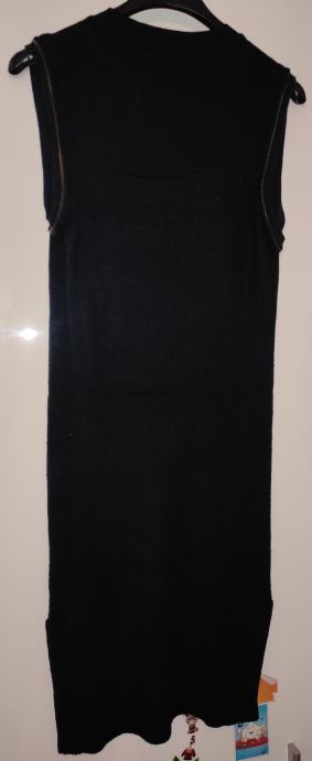 Prodajem crnu džemper tuniku, bez rukava, veličina M, s ukrasnim patentima oko ramena i na rubovima donjeg dijela tunike. Nošena kratko, ima manji nedostatak - par rupica (vidi se na jednoj od slika) koje se pri nošenju niti ne primijete (mogu se naravno sašiti), rupice su nastale od remena nošenog preko tunike. Duljina tunike je 90 cm. Pogledajte i moje ostale oglase, nisam za zamjene jer se rješavam viška.