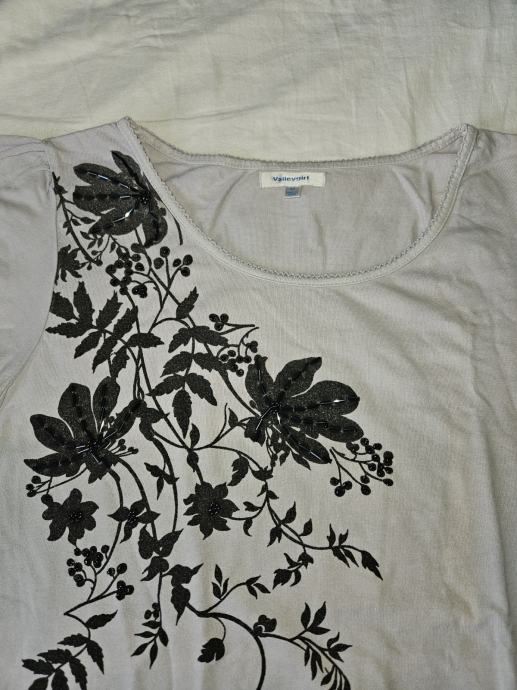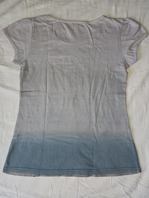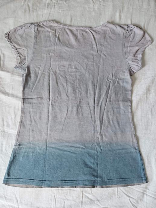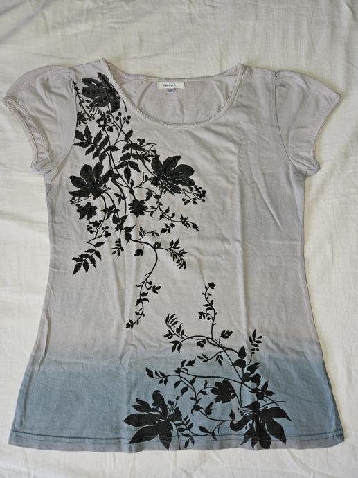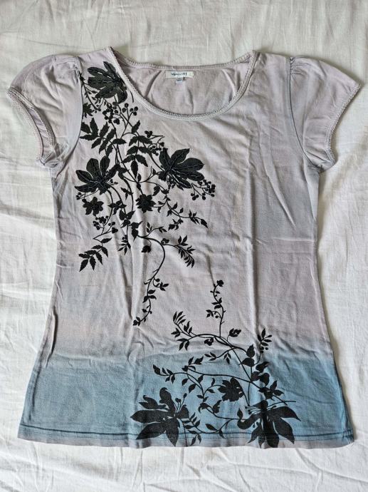 Majica kratkih rukava, pamučna. Plave boje s uzorkom lišća na kojima se nalaze istobojne perlice. Strukirana, elastična. Veličina M, 38. Nošena, očuvana, može se još nositi.