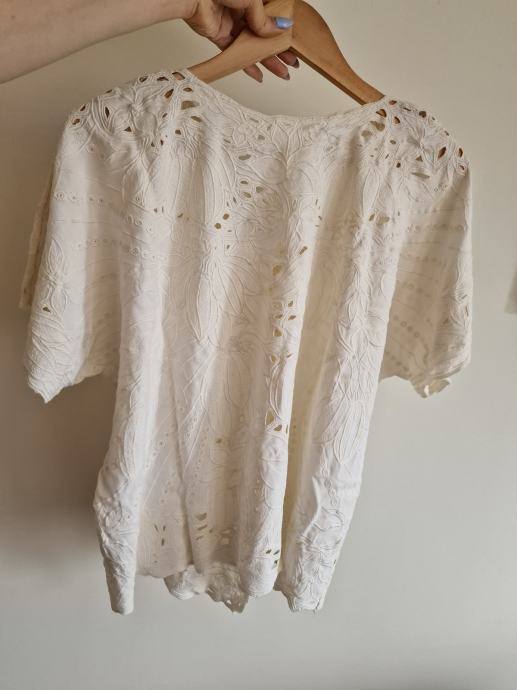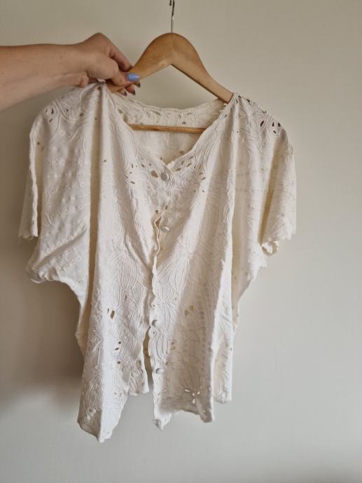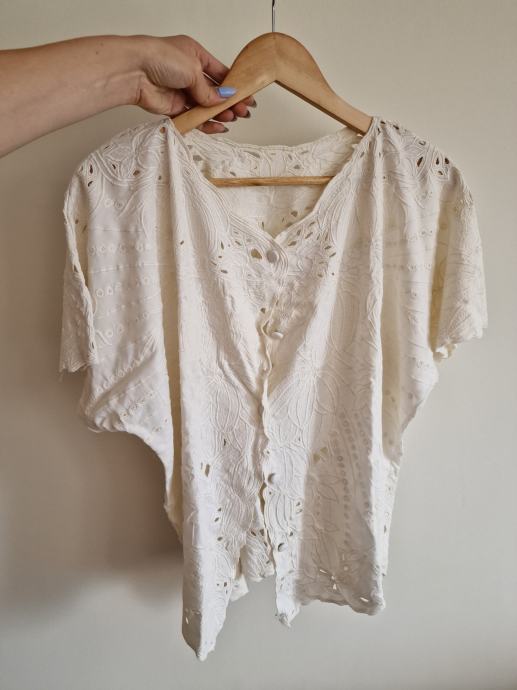 Vintage ženska majica kratkih rukava. Odlično očuvana, još iz 80-ih. Veličina je otprilike 40/L, ali može biti nošena kao i jaknica/preko drugih odjevnih predmeta poput haljina i slično, tako da može odgovarati i 38/M, ili kao oversized komad nekome tko nosi 36/S. Za dodatna pitanja slobodno se javite....