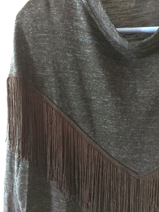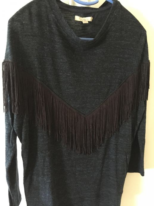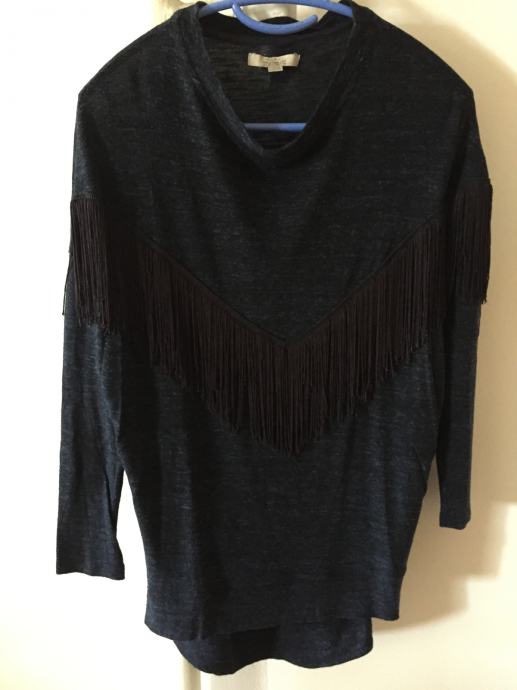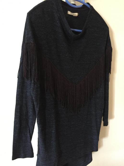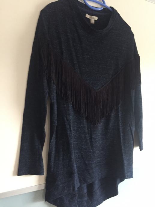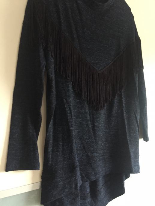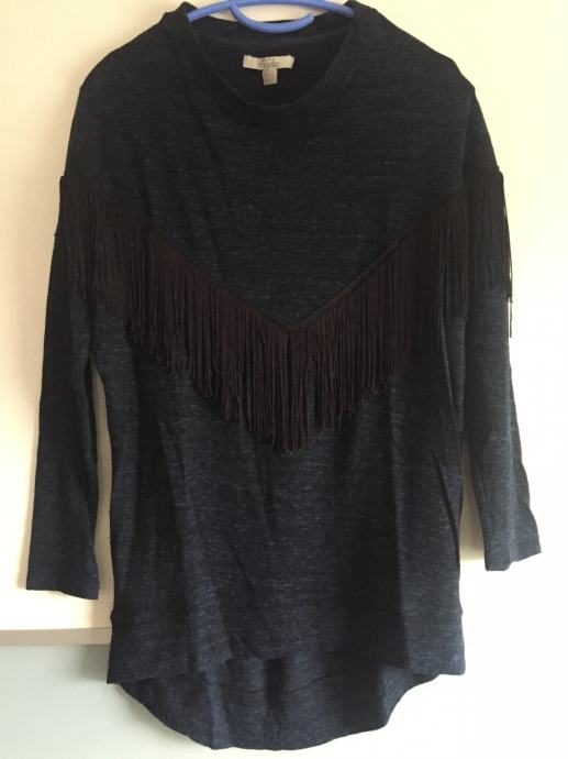Jako lijepa majica iz Zare, veličina S / 36. Zanimljiv model tamnoplave boje sa šarama i crnim resicama. Materijal ugodan, prednja strana mrvicu kraća od stražnje. Meni baš nije sjela, nije moj stil pa prodajem. Nosila sam je jednom, oprala i sad stoji u ormaru. Bez ikakvih oštećenja, očuvana. Poštarina nije uključena. Mogućnost primopredaje u Zagrebu.