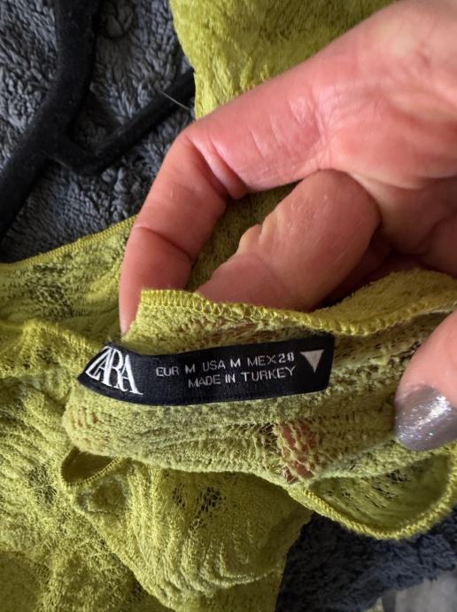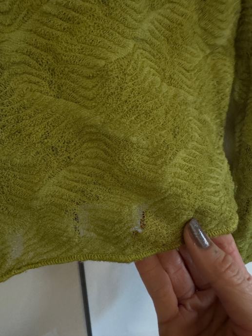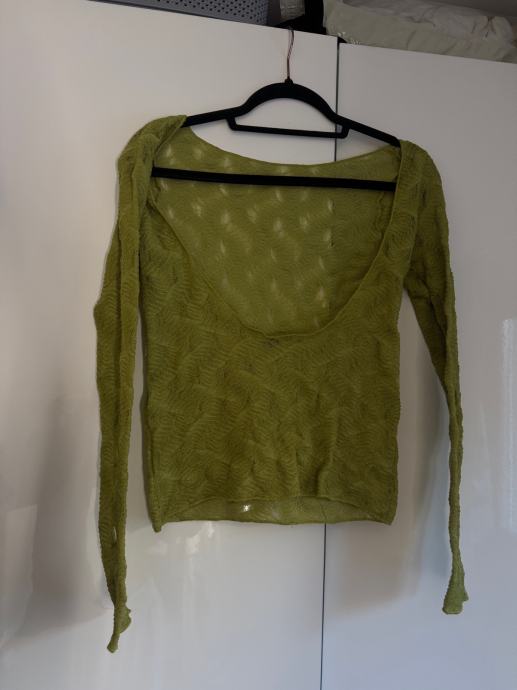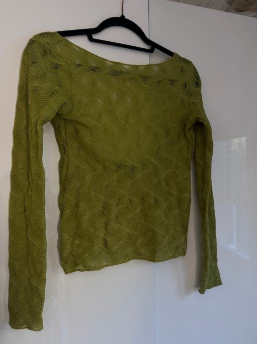 Prodajem zelenu majicu iz zare dugih rukava s otvorenim, golim leđima. Izrađena je od prozirnog čipkastog materijala s valovitim uzorkom u teksturi. Veličina je 38. #thrifterista