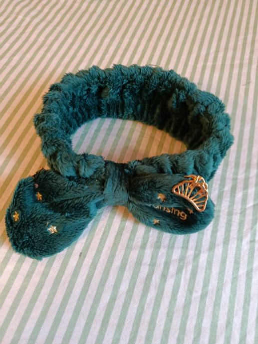 Banila pufasta, plišana, zelena traka za kosu na kojoj piše:"Happy Cleansing". Nekorišteno.