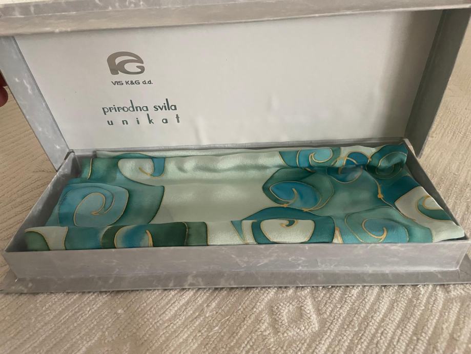 Zenska svilena marama rucno oslikana, unikatna, nova u originalnoj kutiji. Dimenzije 80 x 80 cm. Svijetlo zelena podloga sa oslikanim detaljima koji imaju zlatni rub.