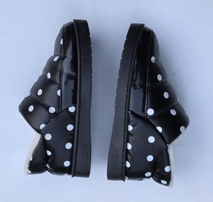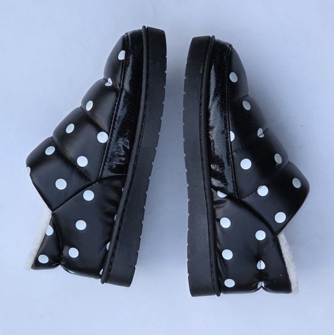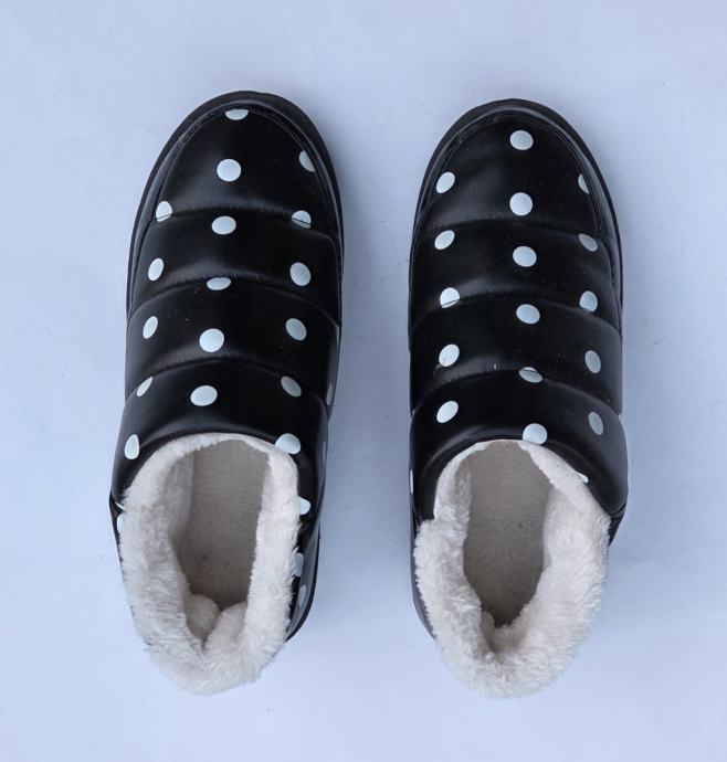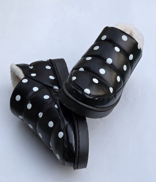 Prodajem očuvane ženske papuče broj 39 s toplim unutrašnjim slojem i crno-bijelim uzorkom s točkicama. Izrađene su od umjetne kože, nošene su nekoliko puta.