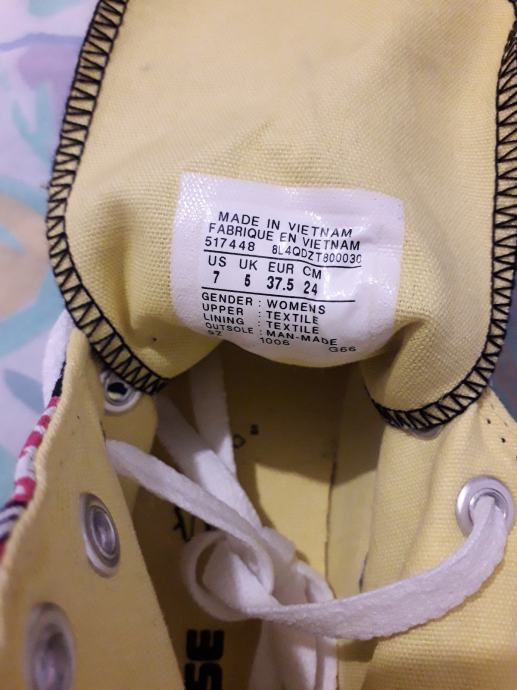 Prodajem potpuno nove Converse All Star tenisice s originalnom etiketom, veličine 37.5. Tenisice su šarenog dizajna s prepoznatljivim tekstualnim printom na crnoj podlozi i žutom unutrašnjosti. Klasičan model s bijelim gumenim vrhom i vezicama, idealne za svakodnevno nošenje.