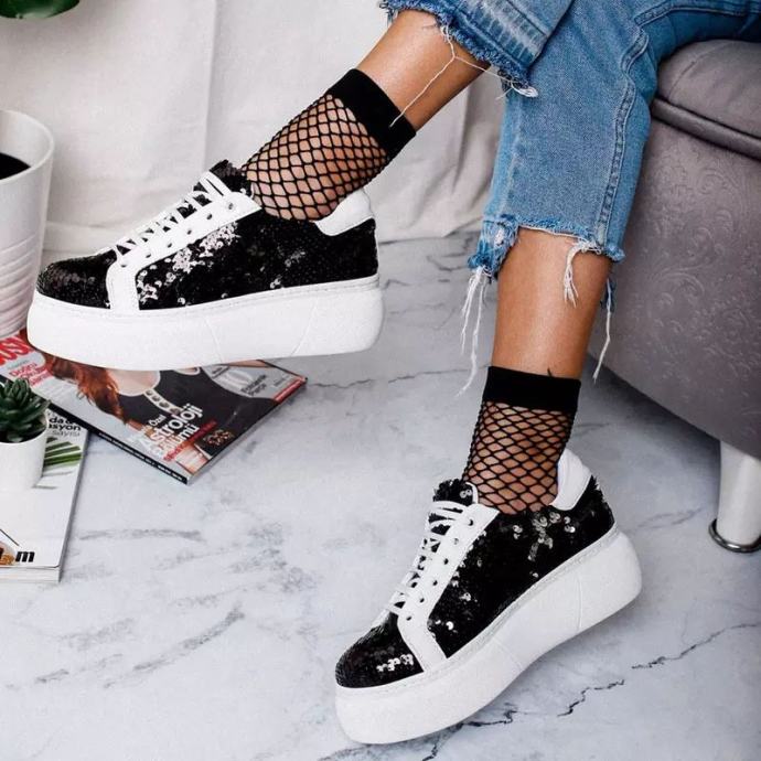Crne, sa šljokičastim uzorkom, jedanput nošene, boja i model kao na slici, veličina 40.