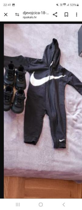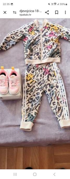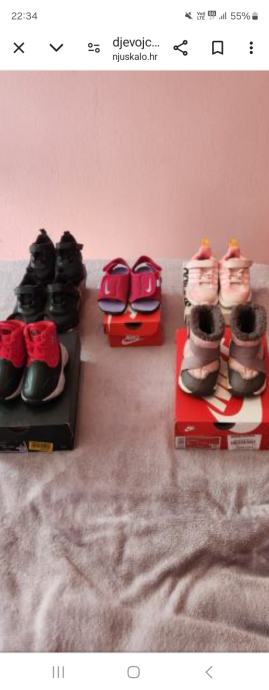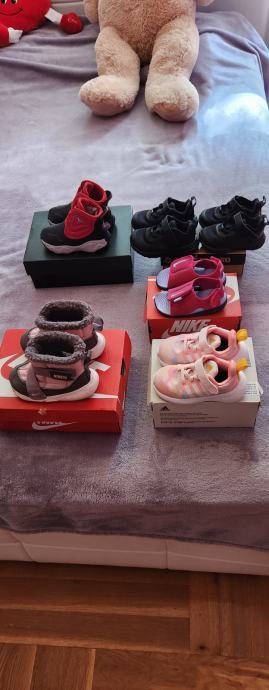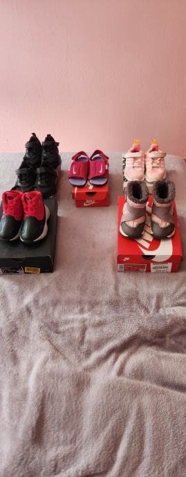 Obuća! Tenisice Adidas camouflage Pink broj 22 , Nike Crne broj 21, Nike Crne broj 22 , Nike Pink sandale za plažu broj 22, Nike Jordan visoke za kišu broj 23.5 , Nike Pink.visoke sa krznom za zimu.broj 22.5 ! Prodaje se sve skupa samo u kompletu , kao novo ,plaćeno oko 500 eura prodajem u pola cijene za 250 eura fixno bez cjenjkanja , za bebu curicu od 18 do 36 mjeseci staru . Molim da me zovu samo oni koji su spremni kupiti sve u kompletu u pola cijene .za 250 eura .(3Trenirke i 6 pari Obuće).