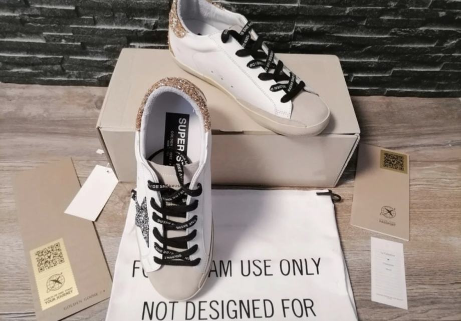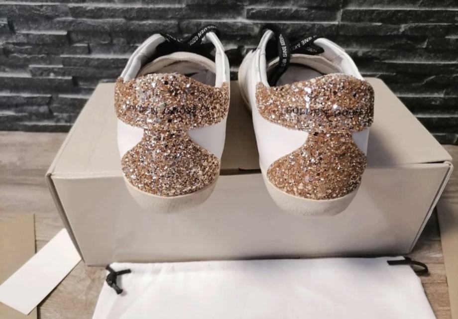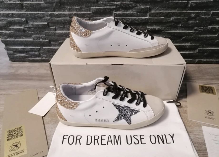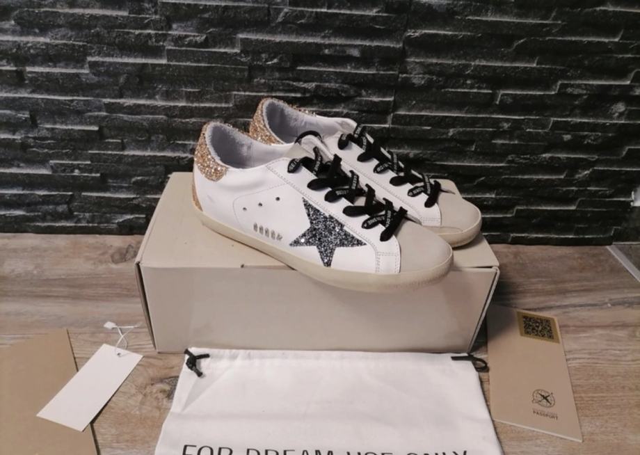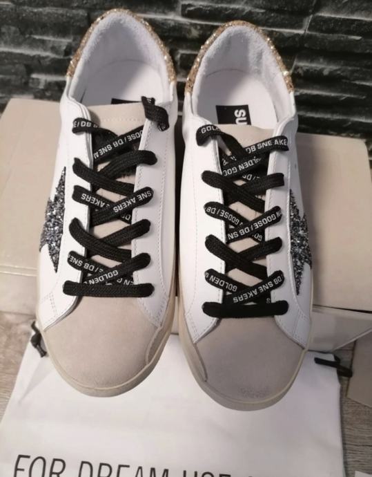 Prodajem Golden Goose ženske tenisice u veličini 40. Tenisice su bijele boje s prepoznatljivom srebrnom zvijezdom sa strane i zlatnim glitter detaljima na peti i stražnjem dijelu. Crne vezice s natpisom "FOR DREAM USE ONLY" dodaju poseban stil. Dolaze s originalnom kutijom i etiketama.