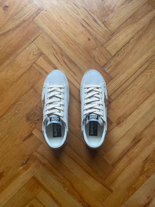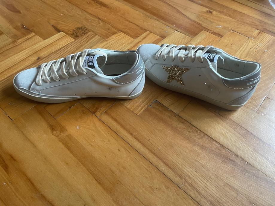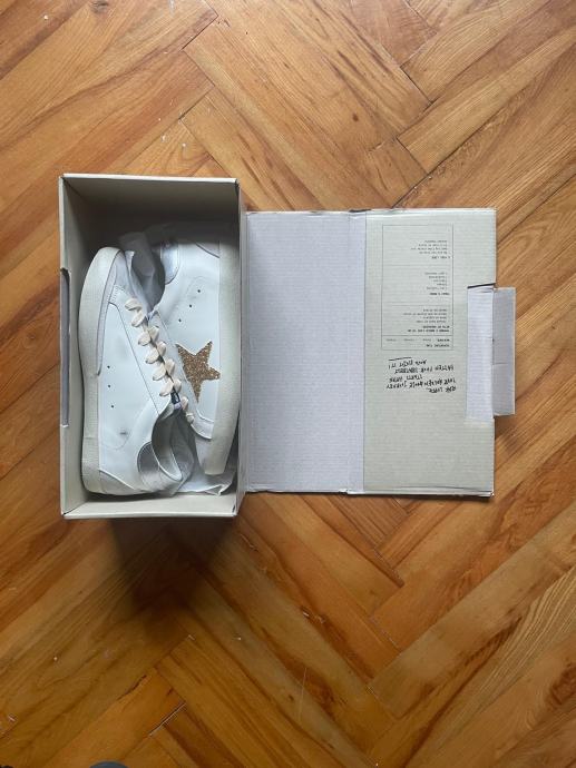 Prodajem potpuno nove Golden Goose tenisice u bež boji, veličine 39, za koje imam i racun. Tenisice imaju prepoznatljiv dizajn s ukrasnom zvjezdicom na bočnoj strani i dolaze u originalnoj kutiji.