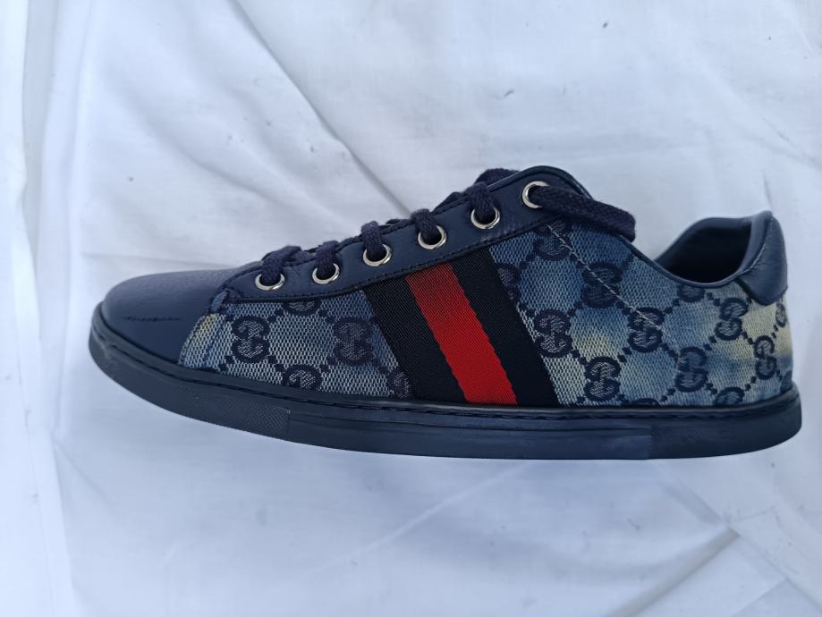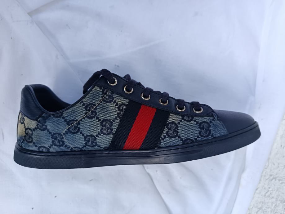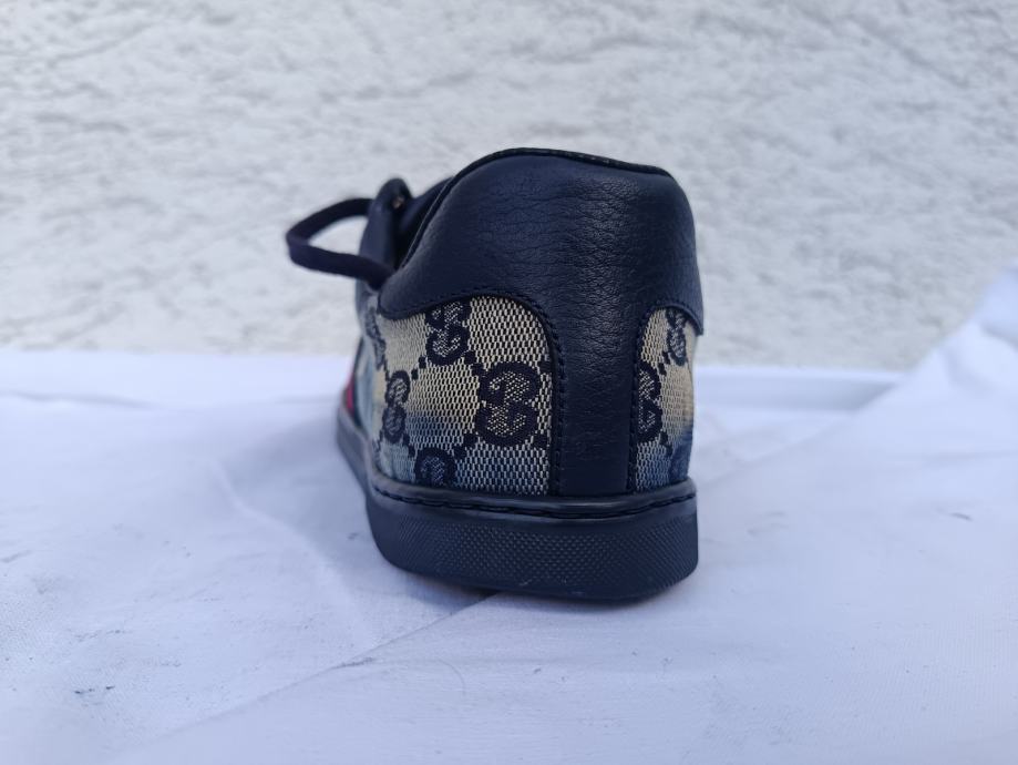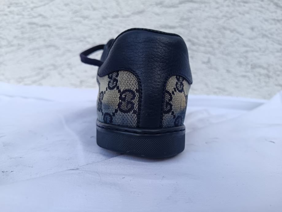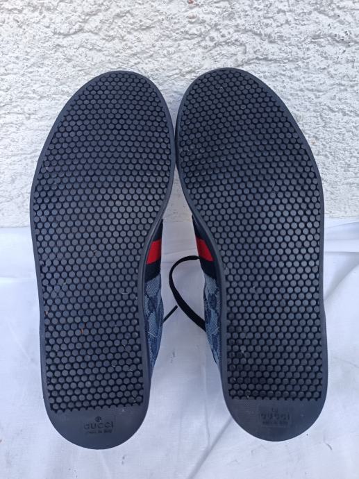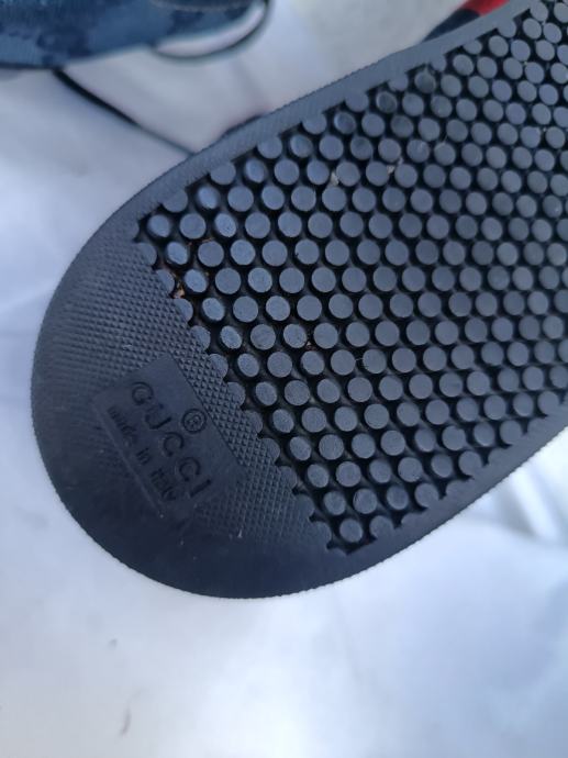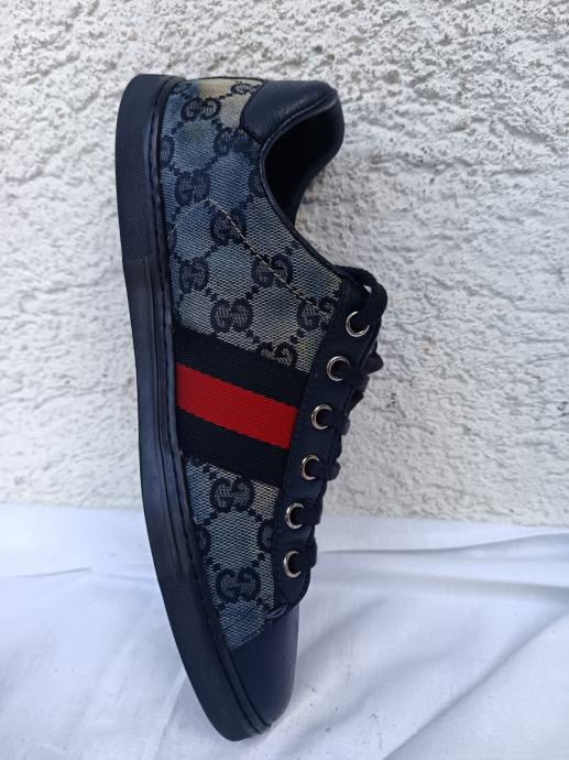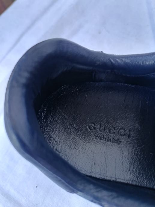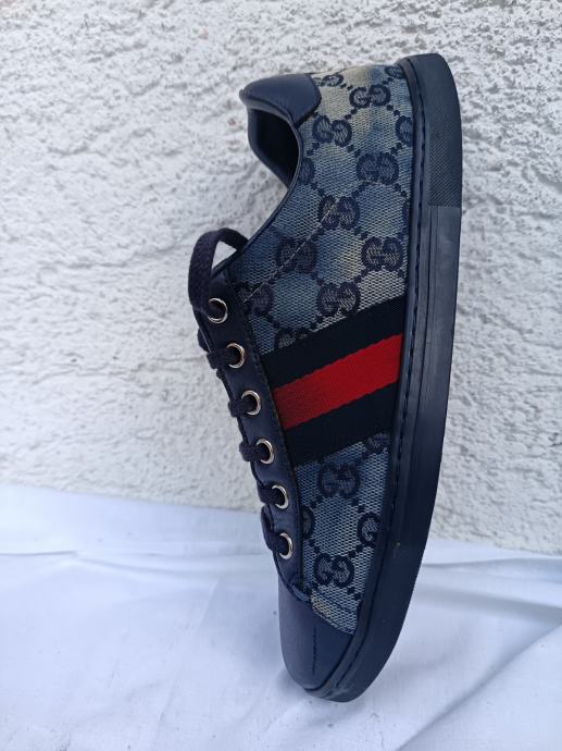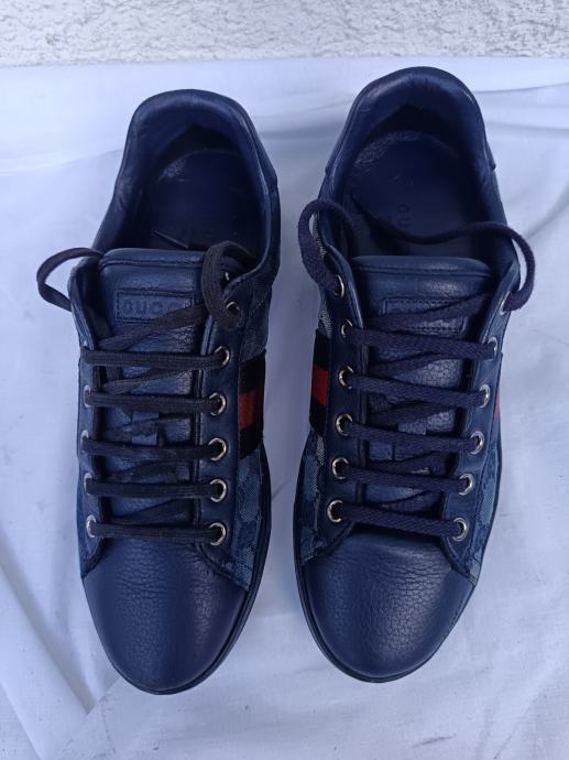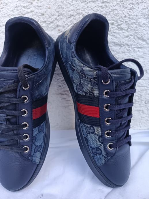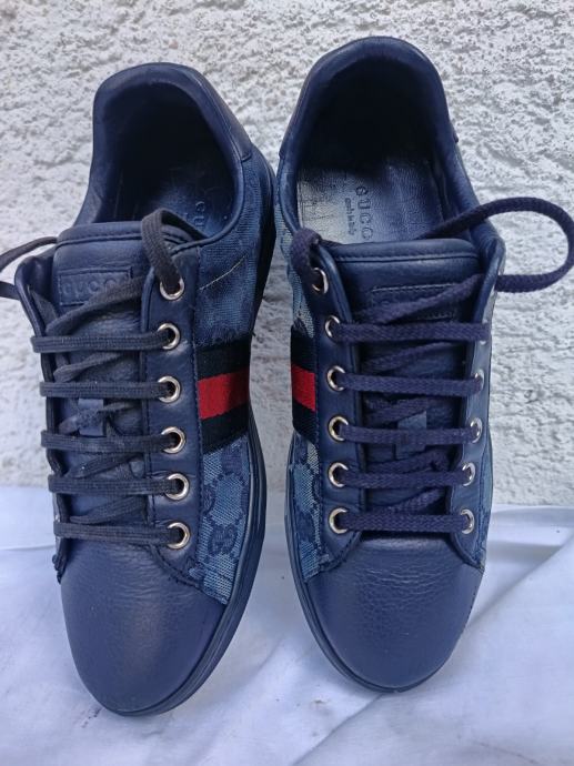 Gucci Ace GG ženske tenisice made in Italy ser. broj za provjeru autentičnosti je 334317- original veličina EUR 37 - steper se vadi ručno izmjeren 24.5 cm...eksterijer dizajnerski tekstil i prava koža tamno plava mat boja...interijer kompletno prava koža....sve ok osim što su se nakon pranja pojavile plave fleke po tekstilnom dijelu eksterijera izvorno bež- sive boje - očito koža plavi lak pušta boju...može se obojati sa plavom bojom za tekstil, biti će praktično bez tragova nošenja........097 764 19 29...fiksni od 19- 21.00....email
