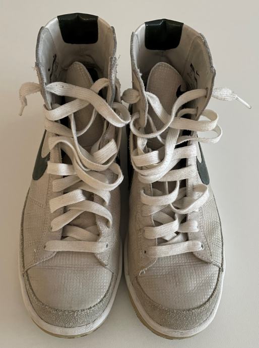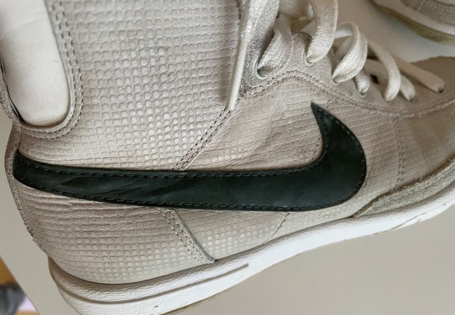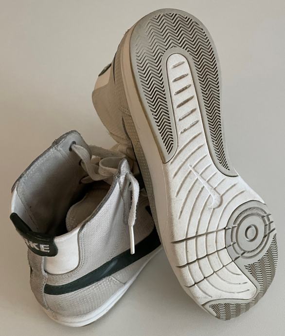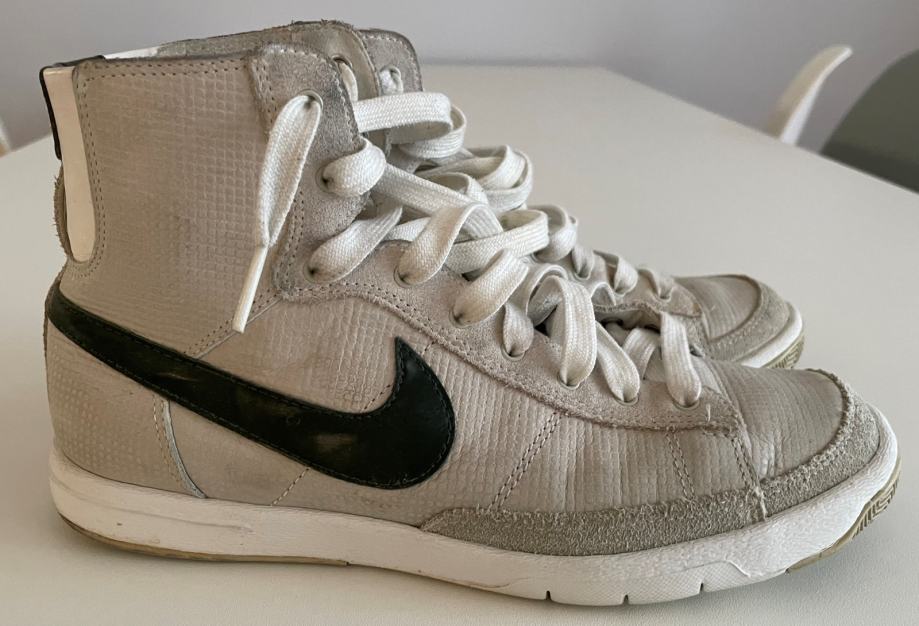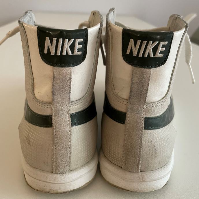 Prodajem Nike visoke tenisice. Tenisice su kratko nošene, očuvane su i u jako dobrom stanju. Broj je 37,5, boja prljavo bijela sa lakiranim tamno zelenim znakom.