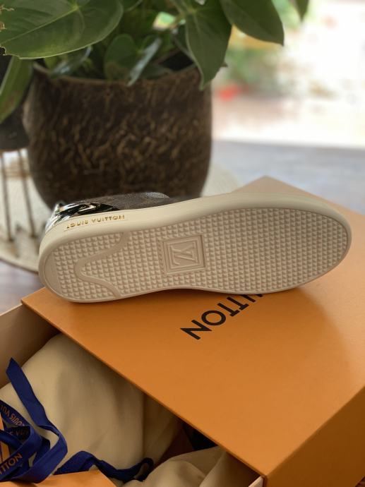 S klasičnim monogramom, crnim detaljima i zlatnim natpisom Louis Vuitton na potplatu.