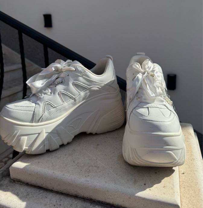 Prodajem platformske patike u bijeloj boji, veličina 39. Radi se o chunky modelu s izraženom platformom i kombinacijom glatkog materijala i mrežice na gornjem dijelu. Vezice su od satenske vrpce, a uz patike dolaze i mali privjesci koji su pričvršćeni na vezice. Platforma je visoka i robusna, s naglašenim đonom.