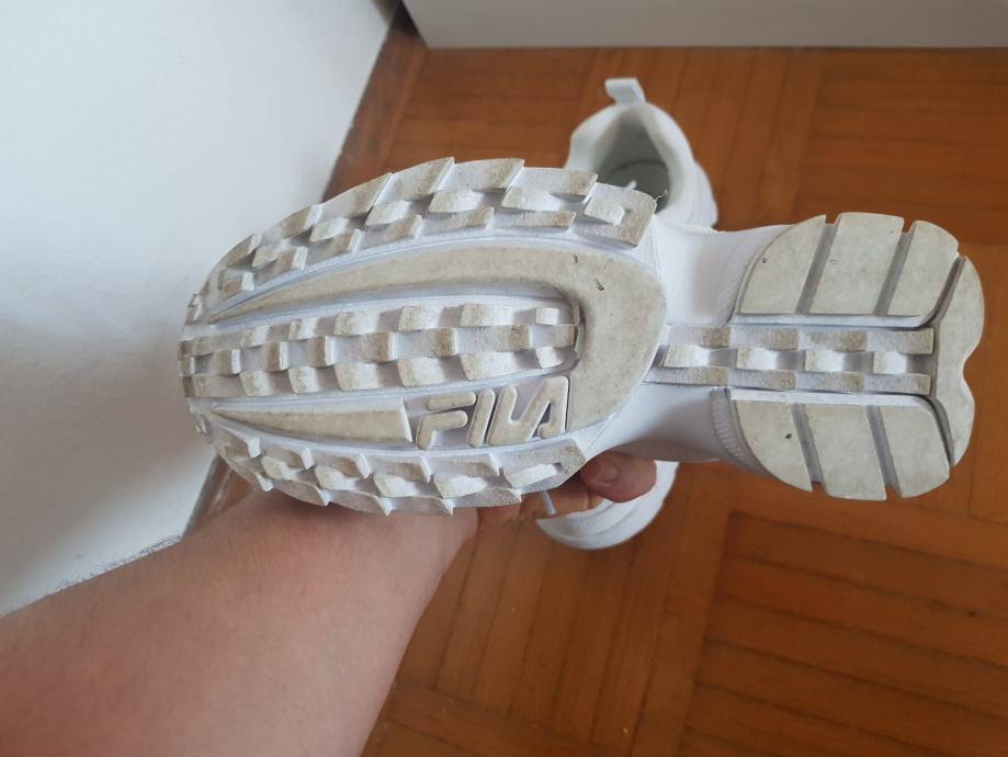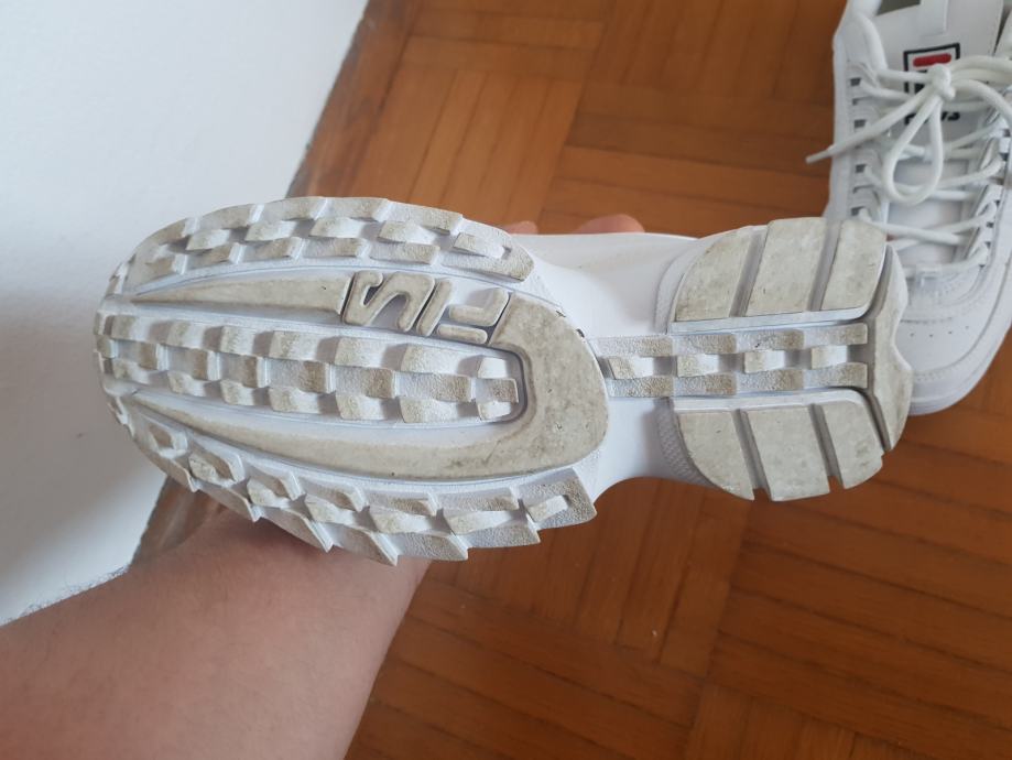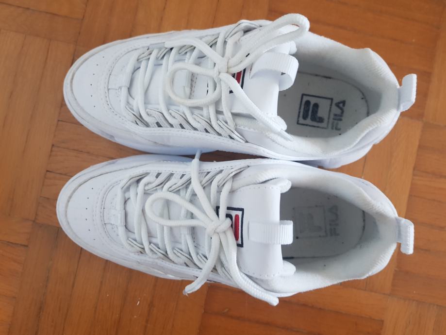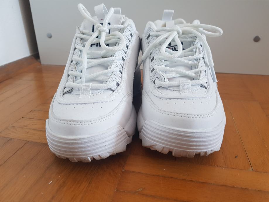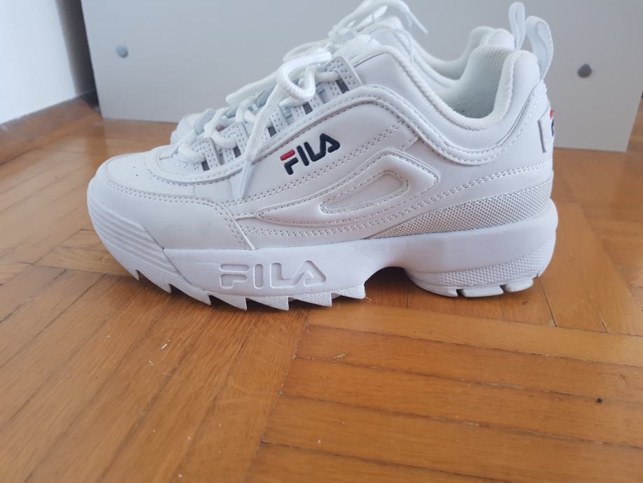Prodajem zenske Fila tenisice model Disruptor low bijele boje,nosene samo tjedan dana jer su mojoj zeni male tako da se radi o novim tenisicama. Placene 100 eura,prodajem za 70 eura. Ali cijena nije fiksna. Slike govore 1000 rijeci...