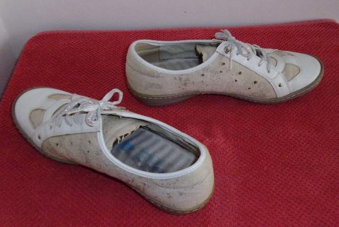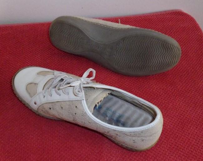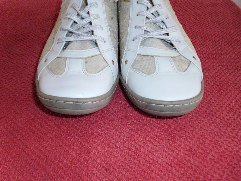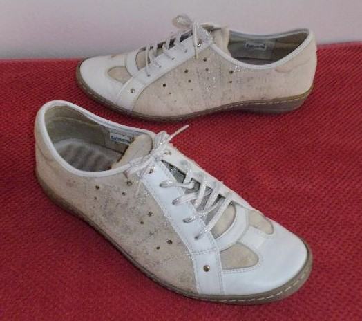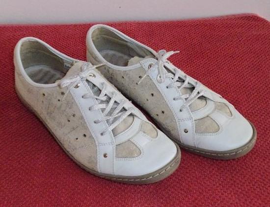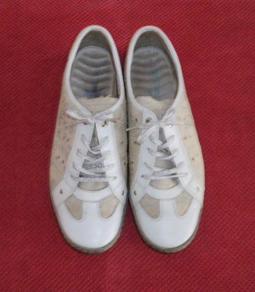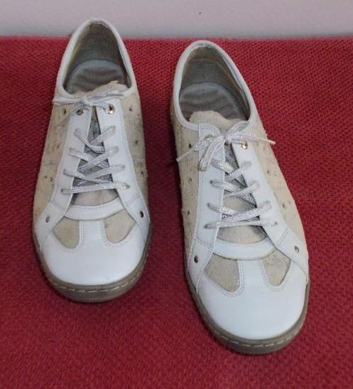" Softwaves " ženske tenisice br. 40, gornjište od prave kože i tekstila, potplat od gume. Uklonjiv uložak za masažu sa valovima, izuzetno udobne za nošenje. Boja bež/bijela/srebrna, unutarnje gazište 26 cm.