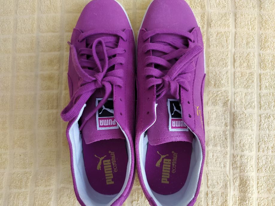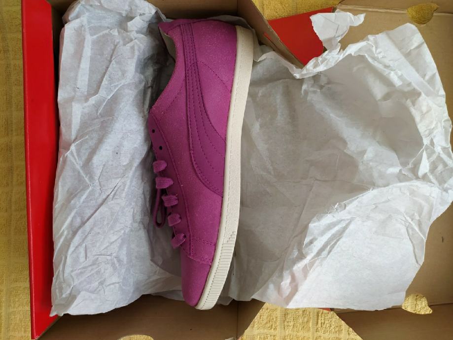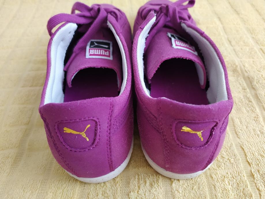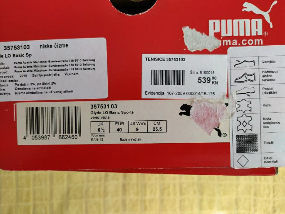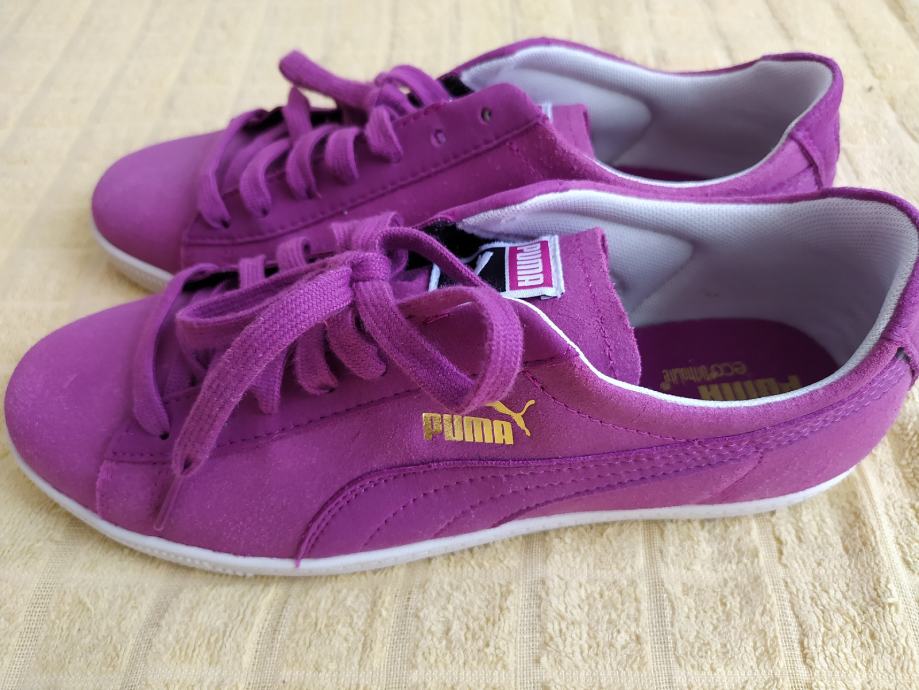 Tenisice ženske "puma" br 40. Ljubičasta boje s zlatnim puma znakom, bijela unutrašnjost, ljubičastim vezicama. Gornjište je od kože/gume, unutarnji dio je textil, tabanica guma. Lagane udobne patike za outdoor aktivnosti. Potpuno nove nikada nošene. Nove u kutiji.