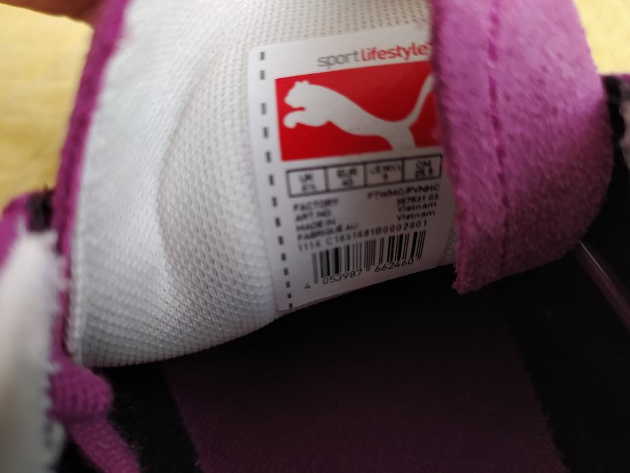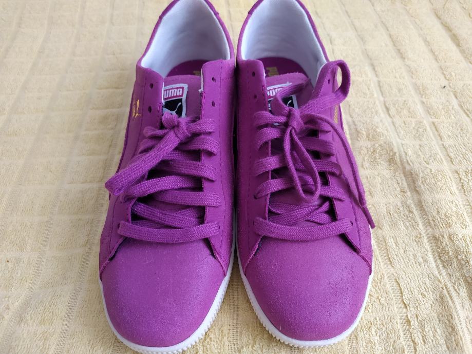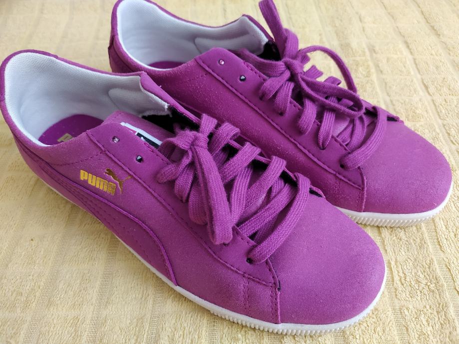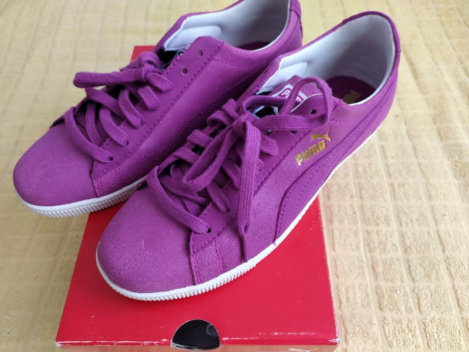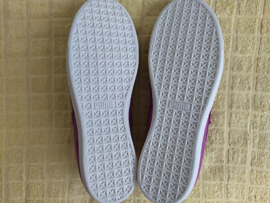 Tenisice ženske "puma" br 40. Ljubičasta boje s zlatnim puma znakom, bijela unutrašnjost, ljubičastim vezicama. Gornjište je od kože/gume, unutarnji dio je textil, tabanica guma. Lagane udobne patike za outdoor aktivnosti. Potpuno nove nikada nošene. Nove u kutiji.