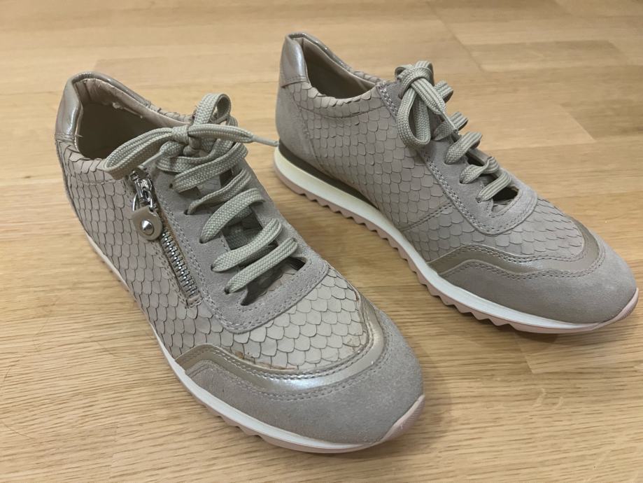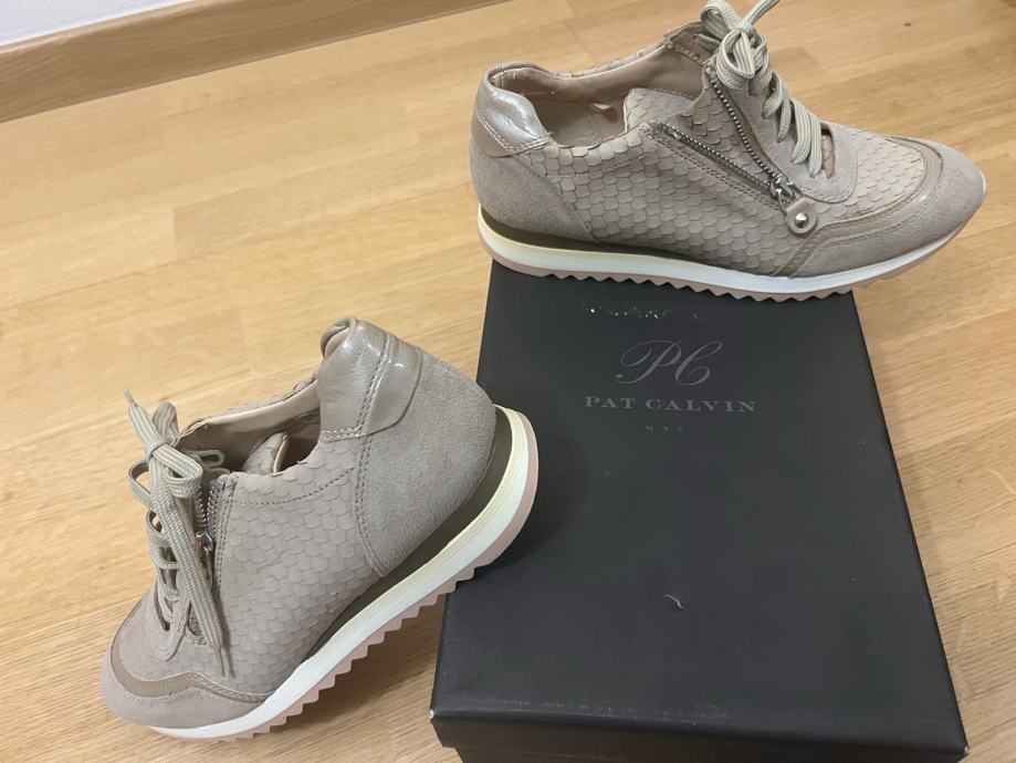 Potpuno nove ženske tenisice od prave kože u bež boji, veličine 38. Modernog su dizajna s reljefnim uzorkom i bočnim patentnim zatvaračem. Udobne su za nošenje s ravnim potplatom idealne za svakodnevne aktivnosti.