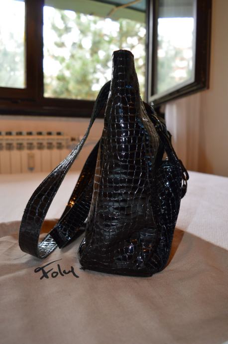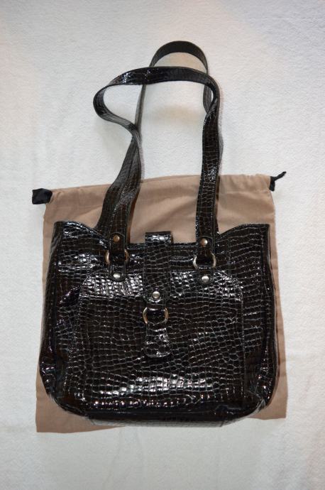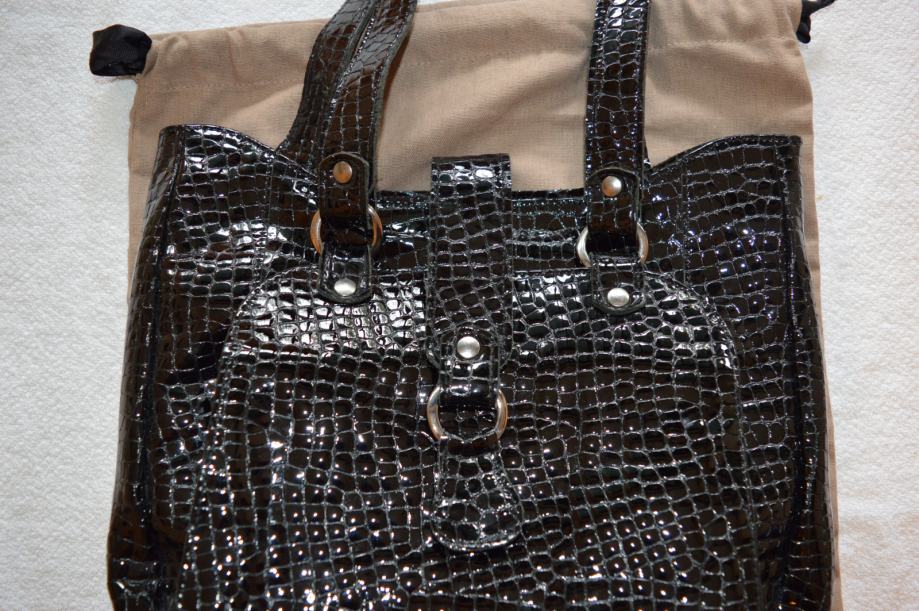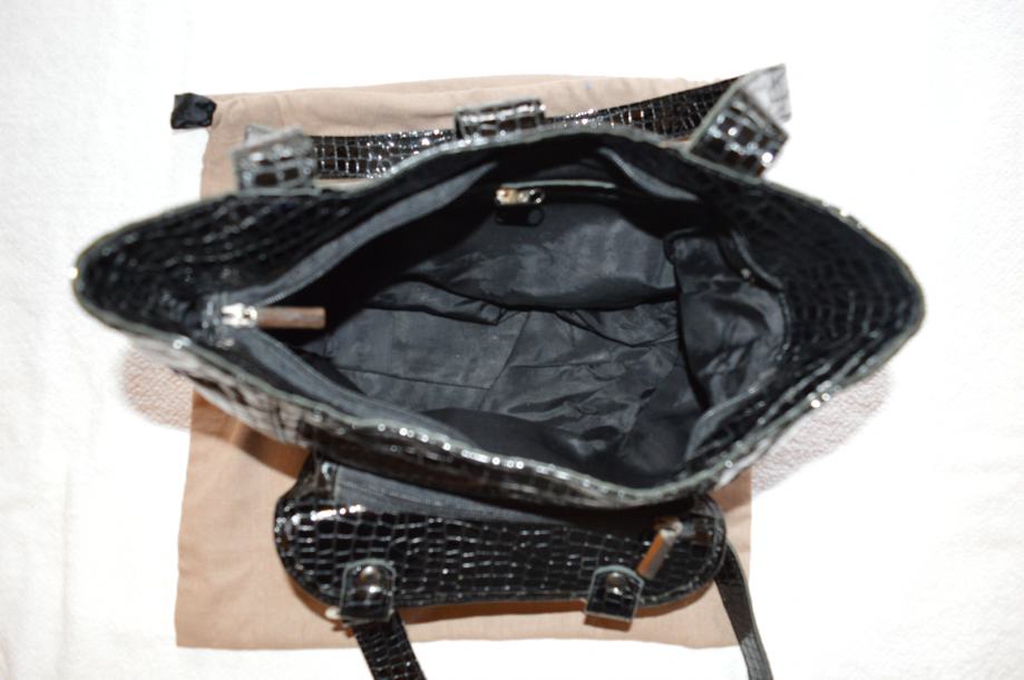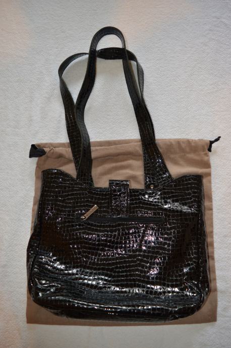 Kao nova, par puta nošena. Crne boje od kože. S prednje i stražnje strane pretinac na cif. Unutra 1 manji pretinac na cif i 1 za npr. mobite. Torba ima podstavu. kopča se na cif i na magnet. dimenzije bez ručki visina cca 28 cm, duljina cca 35, širina dna 10 cm. Ručke cca 43 cm.