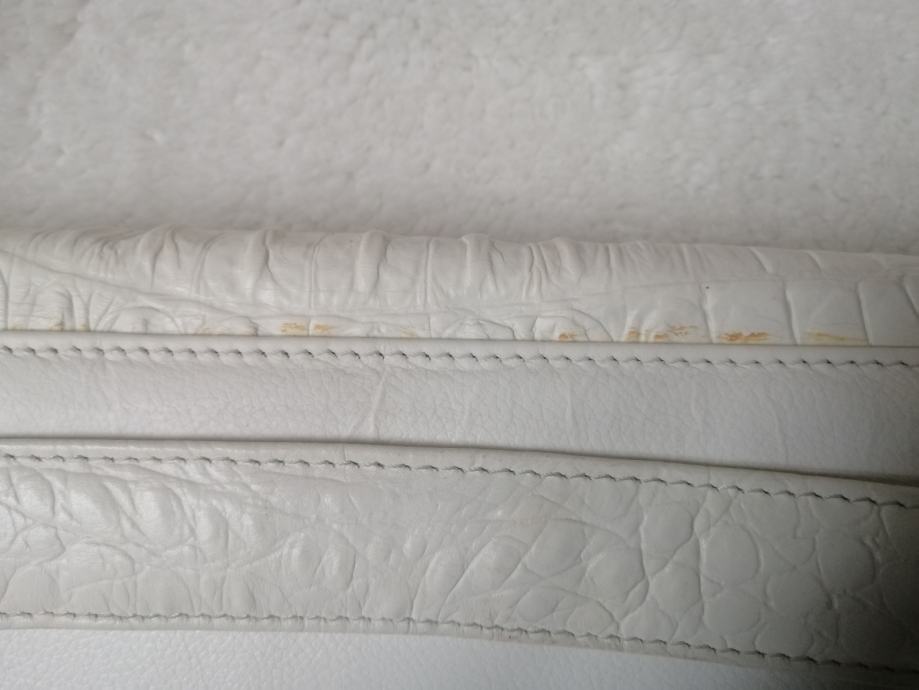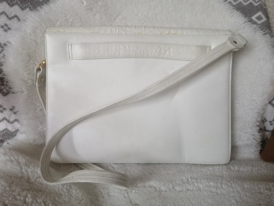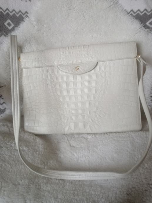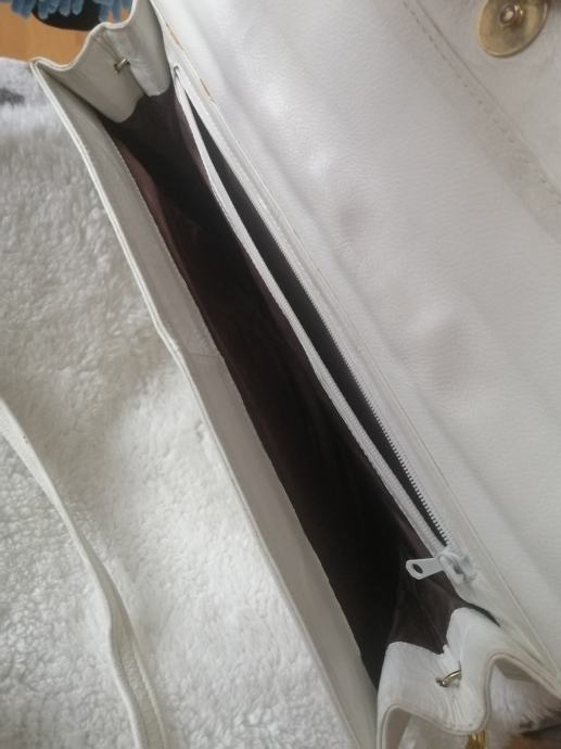 Bijela kožna torba za na rame, 35 x 26 cm. Očuvana osim pokoje mrljice uz rub poklopca na stražnjoj strani što se ne vidi prilikom nošenja.