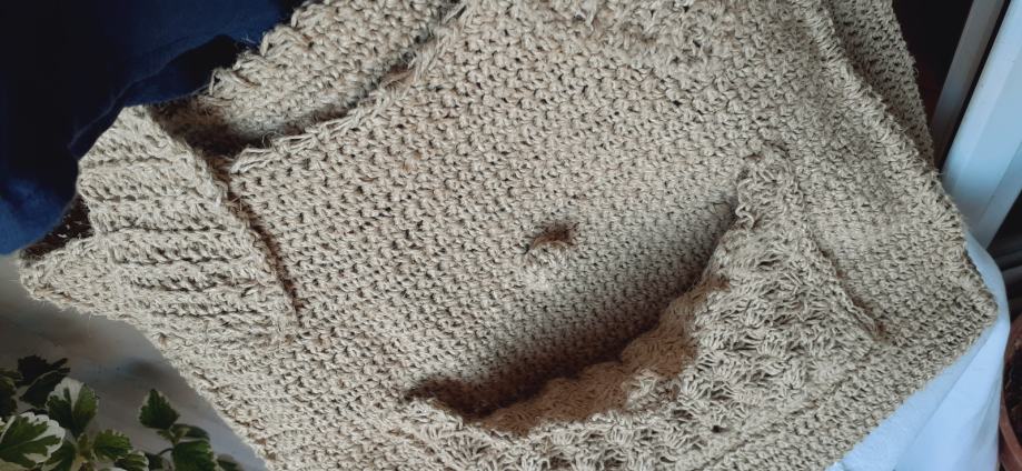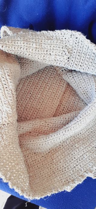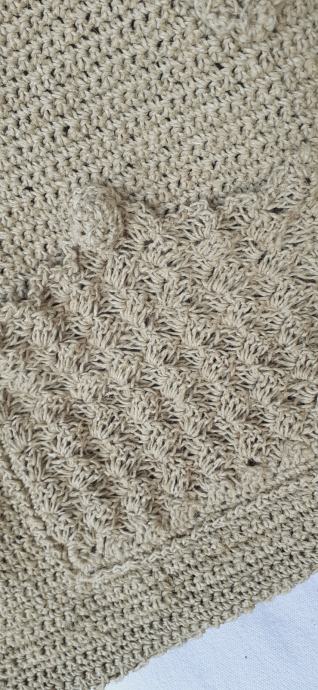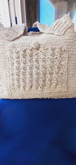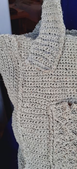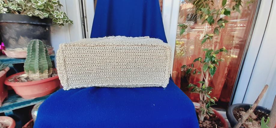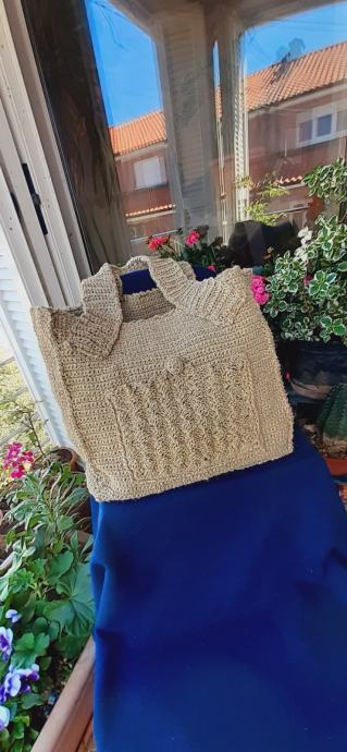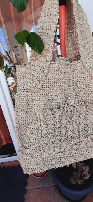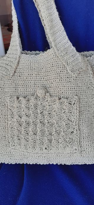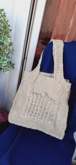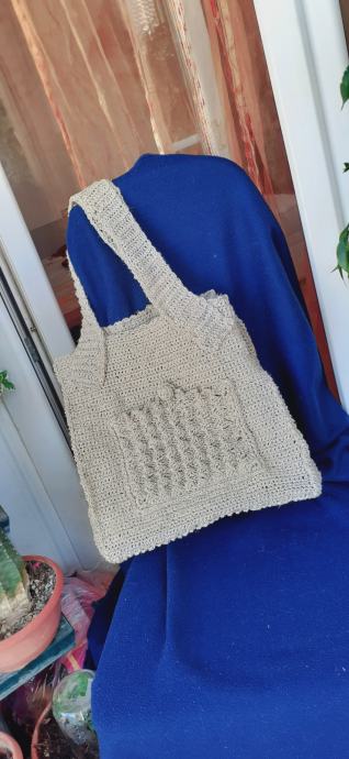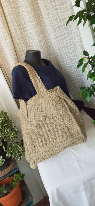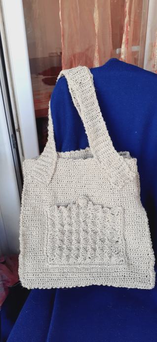 Nova torba osobne izrade, heklana od vlakana konoplje-kudelje, u nekoliko strukturiranih uzoraka, sa prednjim džepom, koji se kopča heklanim dugmetom. Širna xvisina 35X35, dvije duže naramenice šrine 6 cm, dužine 25 cm mjereno od vrha torbe, pravokutno pojačano dno 35X15 cm.