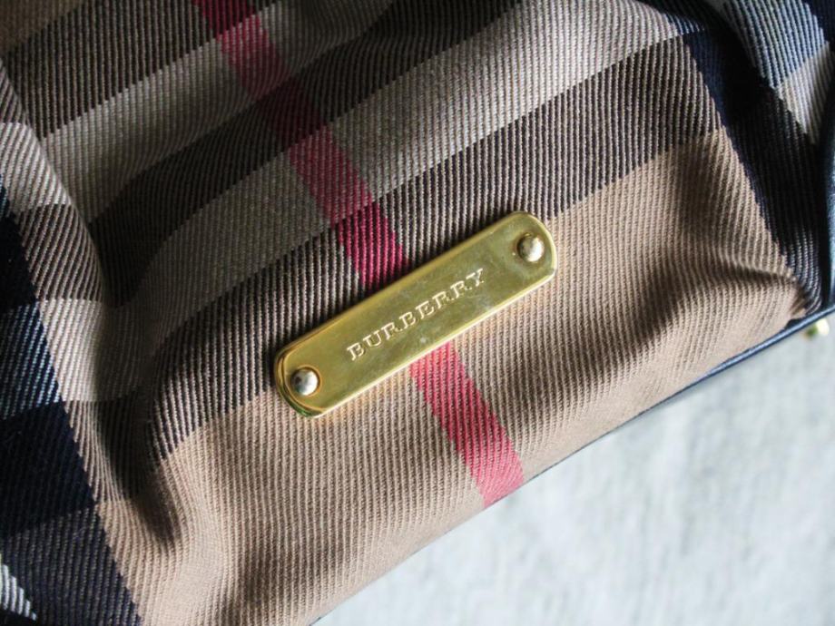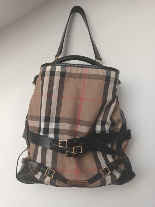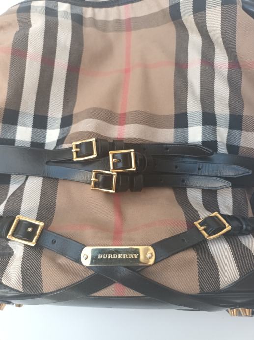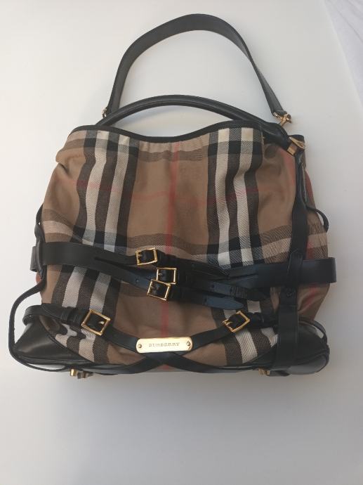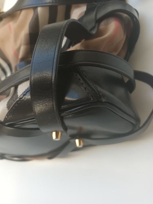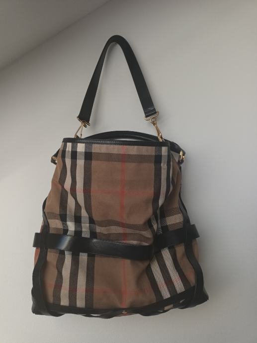 Burberry original dizajnerska torba koža u kombinaciji sa patentiranim Burberry canvasom što je durabilan materijal otporan na ogrebotine i vodonepropustan, iznutra prostrana, ima pretince i pregradu na cif te sa svake strane dva džepa, na dnu capice na kojima stoji kožno postolje, odvojivi remen za preko ramena i ručka za nošenje u ruci
