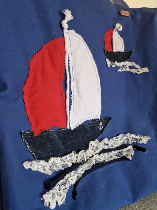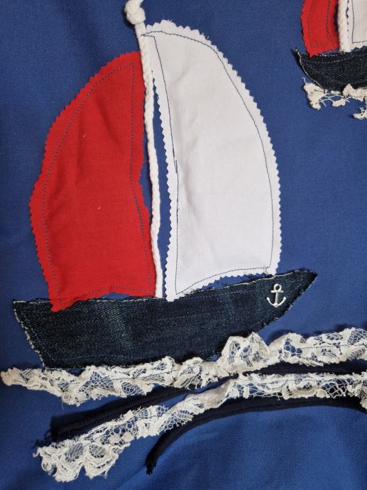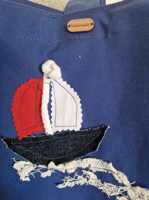 Prodajem mirisni širi u kraljevsko plavoj boji s ručno rađenim aplikacijama s nautičkim motivima. Na prednjoj strani nalaze se dvije jedrilice izrađene od različitih materijala, uključujući traper i čipku, u kombinaciji crvene, bijele i tamnoplave boje, s motivom sidra. Torba je prostrana, s dugim ručkama pogodnim za nošenje preko ramena. Stanje je novo bez etikete.