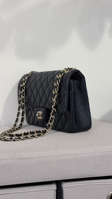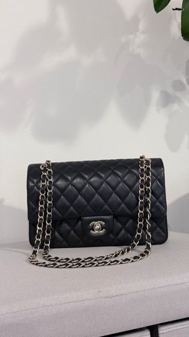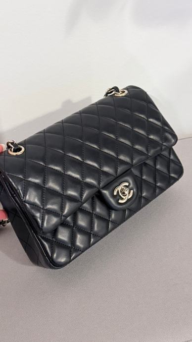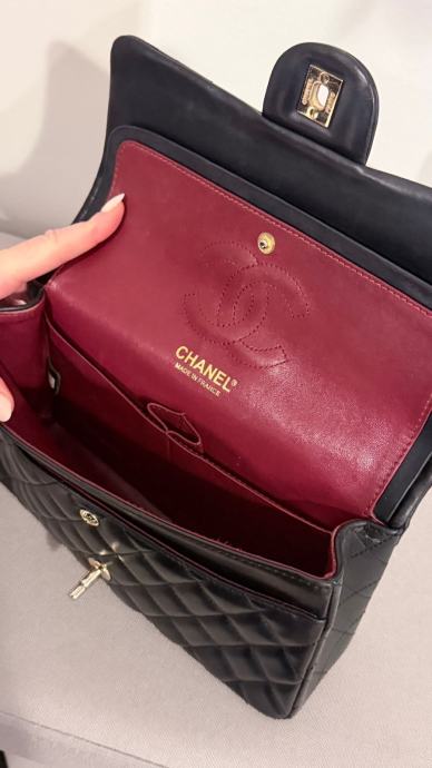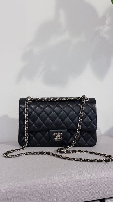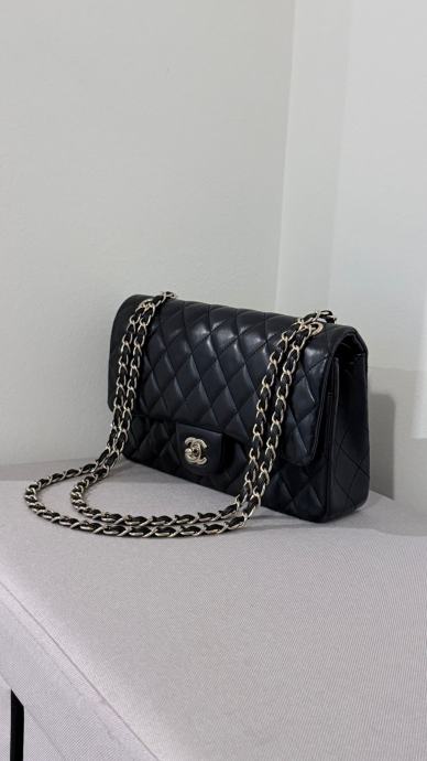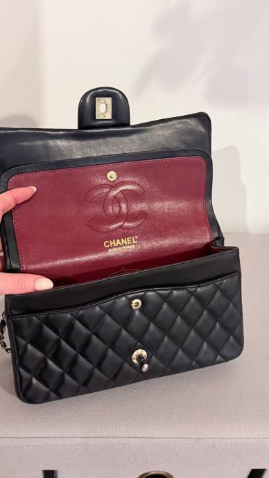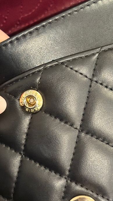 Prodajem elegantnu Chanel torbicu u crnoj boji. Torbica ima klasičan dizajn s metalnim lancem koji služi kao naramenica. Unutrašnjost je bordo crvene boje, s dostatno prostora za sve potrebne stvari. Torbica je nova.