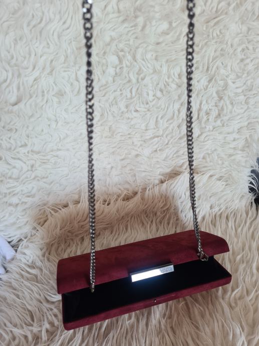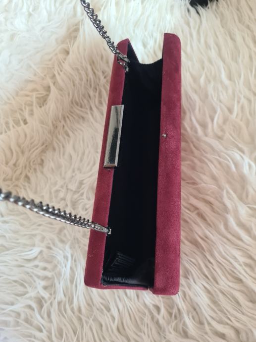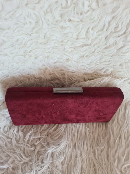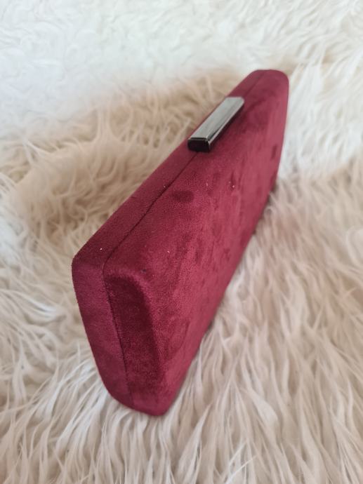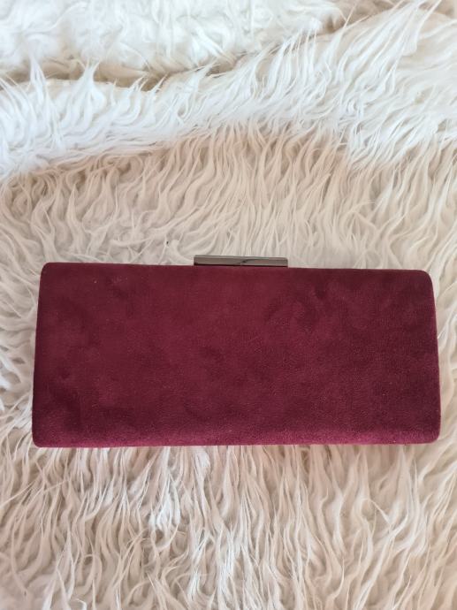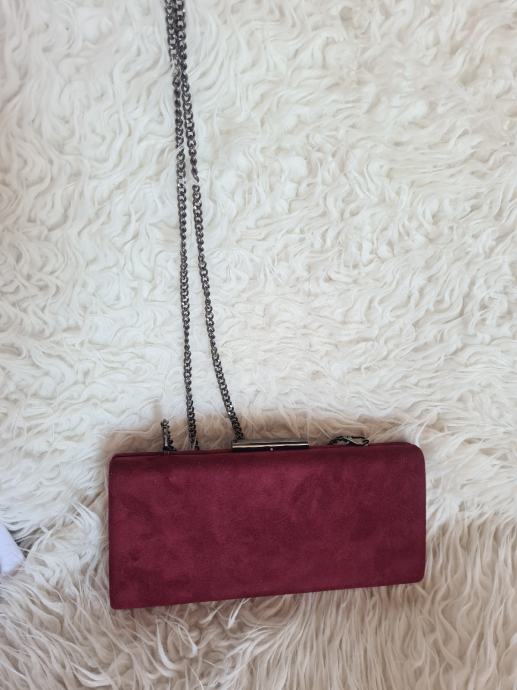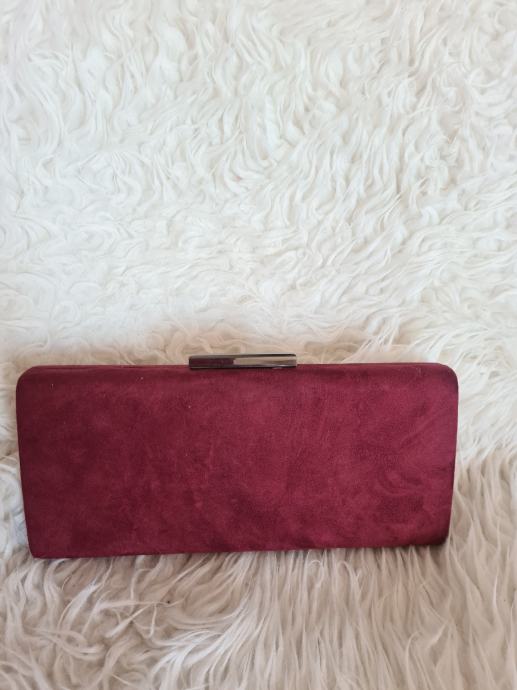 Prekrasna bordo clutch torba, sa dugim remenom. Imitacija brušene kože. Dimenzije 25.2x11.5x4cm.