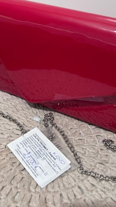 Elegantna clutch torbica u efektnoj crvenoj boji, potpuno nova s etiketom. Savršen modni dodatak za posebne prilike s laganim sjajnim završetkom i praktičnim zatvaranjem.