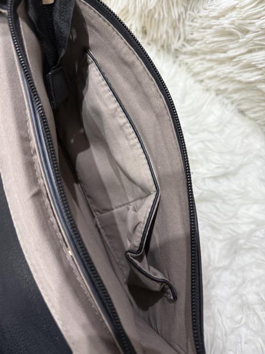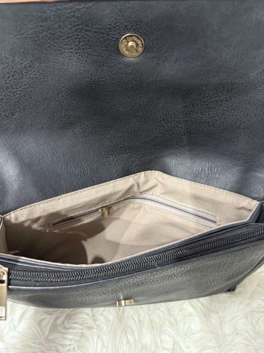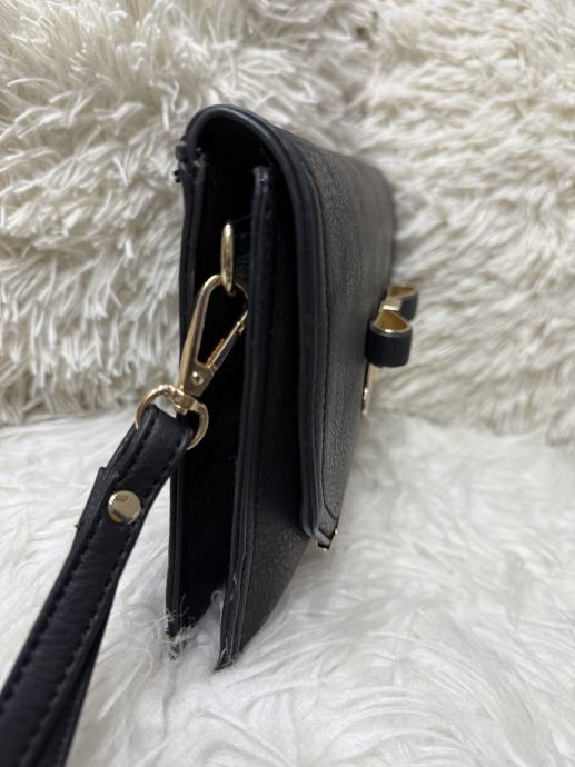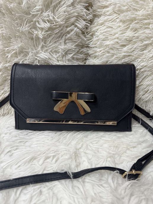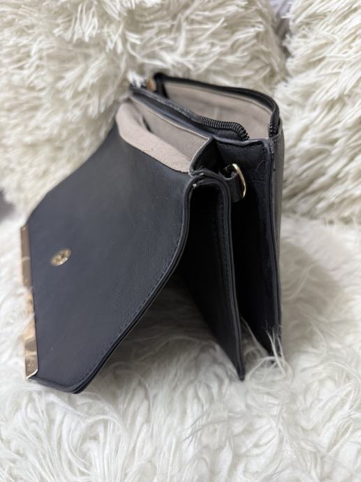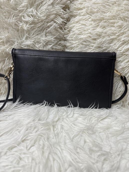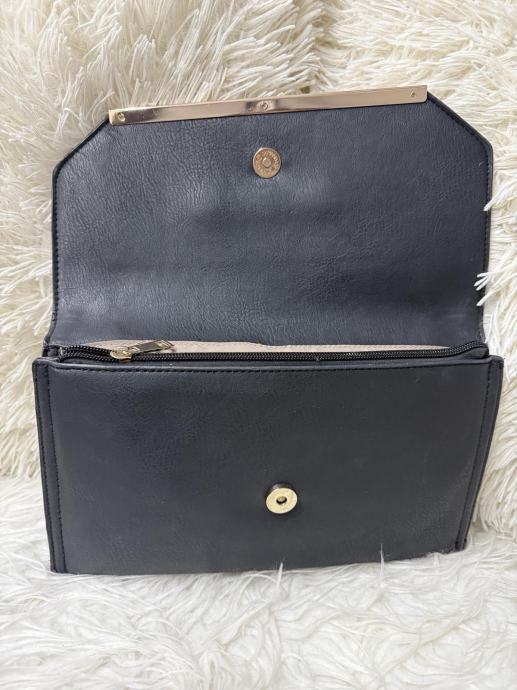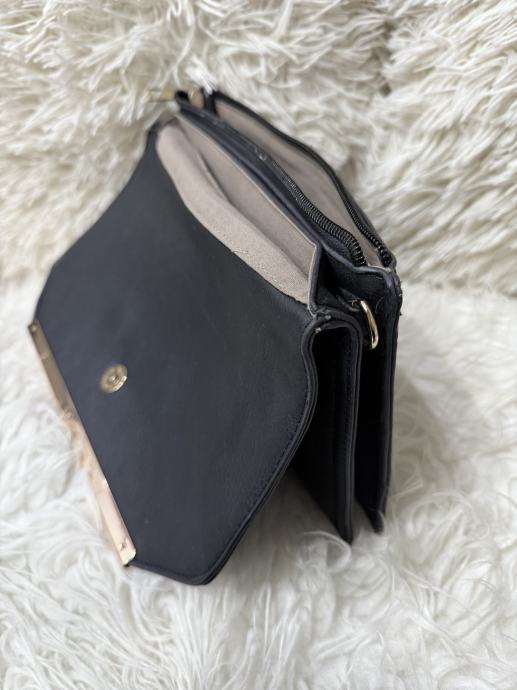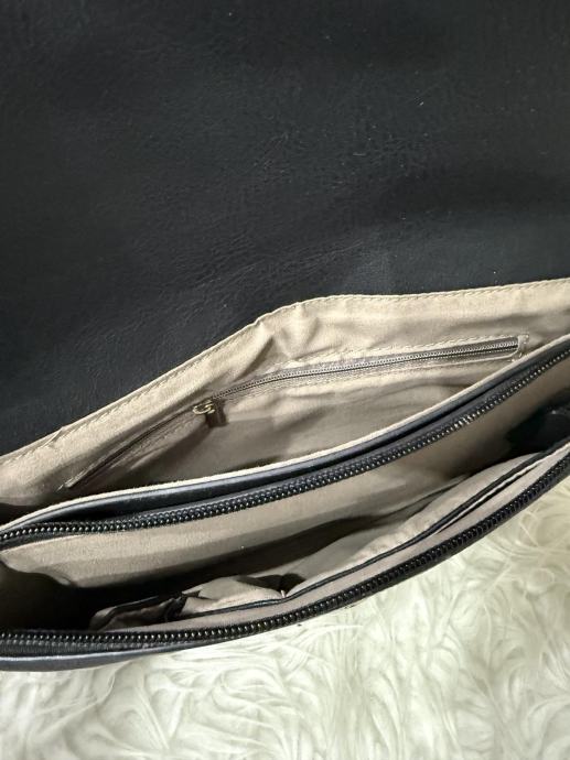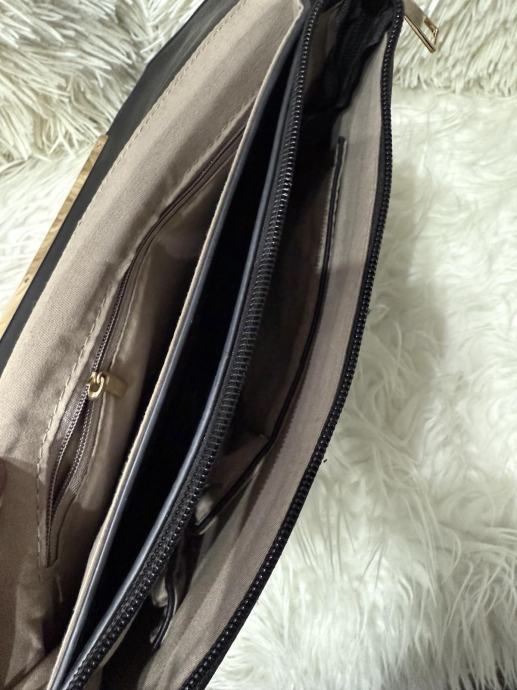 Nošena samo nekoliko puta; dvije vrste zamjenjivijih i podesivih naramenica - preko tijela i oko ruke ili mogućnost nošenja bez naramenice; crna s zlatnim detaljima; više pretinaca s zatvaračem; dimenzije: 28 cm širina, visina 16 cm, debljina 2,5 cm