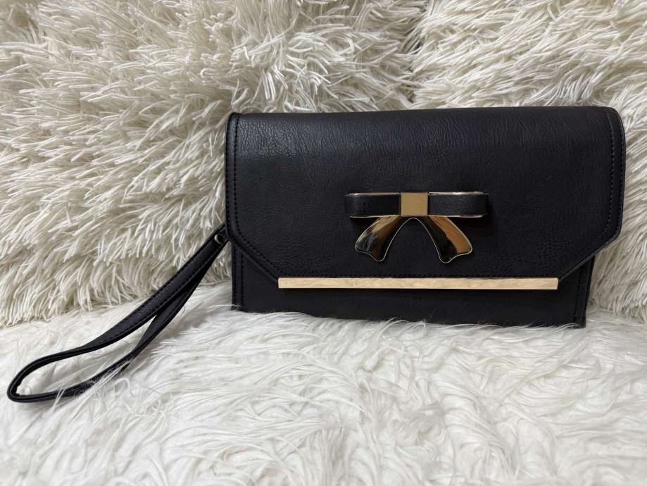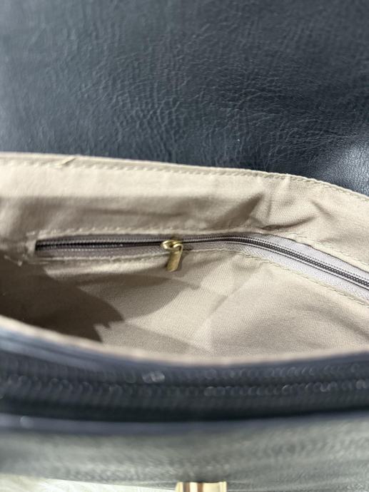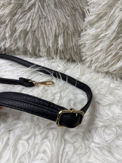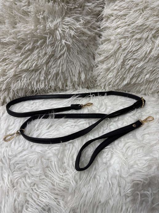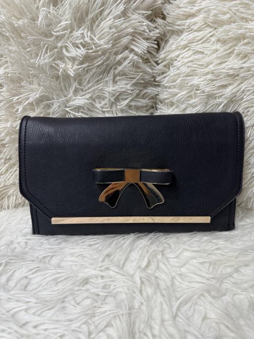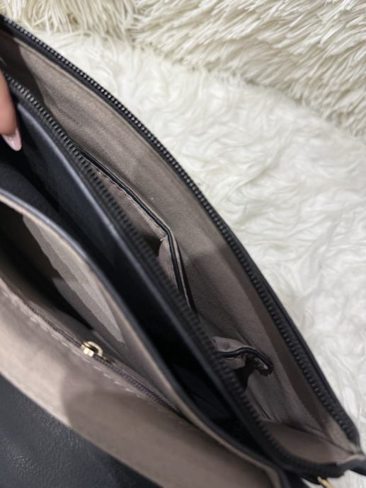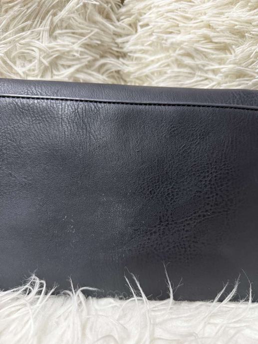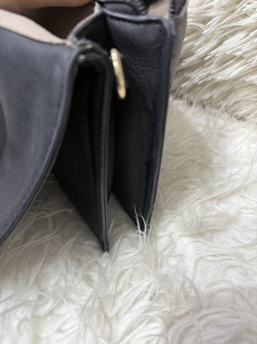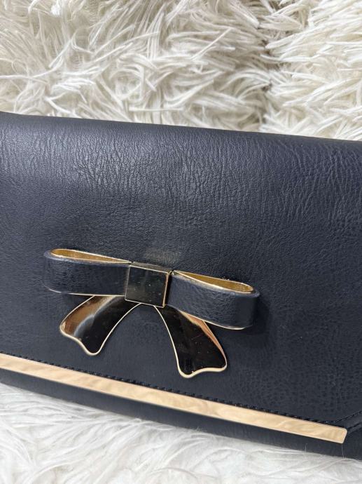 Nošena samo nekoliko puta; dvije vrste zamjenjivijih i podesivih naramenica - preko tijela i oko ruke ili mogućnost nošenja bez naramenice; crna s zlatnim detaljima; više pretinaca s zatvaračem; dimenzije: 28 cm širina, visina 16 cm, debljina 2,5 cm
