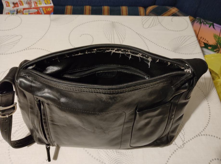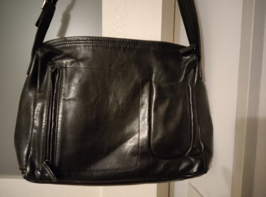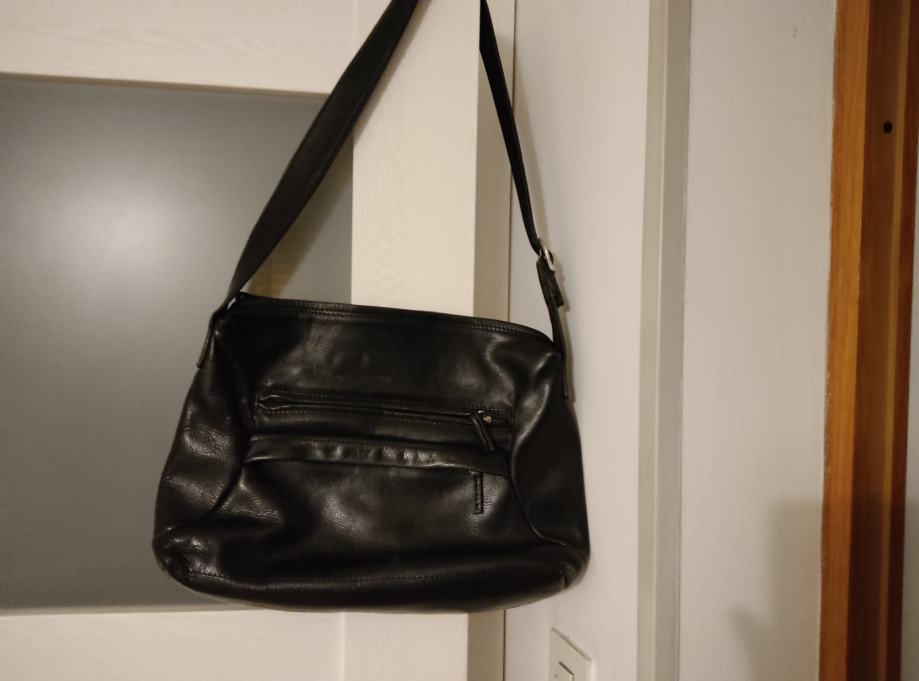 Torbica ženska crna od prave čvrste kože. Ima izvana puno pretinaca. Iznutra ima samo odvojeni đepić sa cifom. Torba je dosta nošena što se vidi iz nutra jer ima futer od skaja pa se malo pri vrhu pohabao, ali iz vana je koža odlična, kao da nije ni nošena. Dimenzije su širina oko 36, visina 26 a ručka 83 cm
