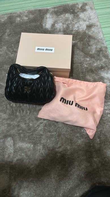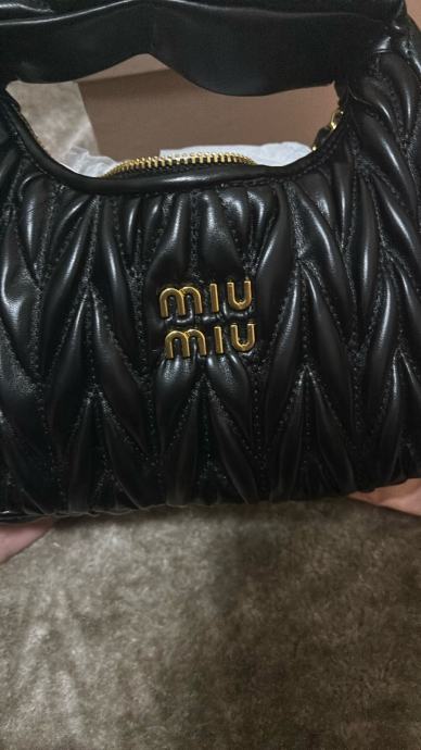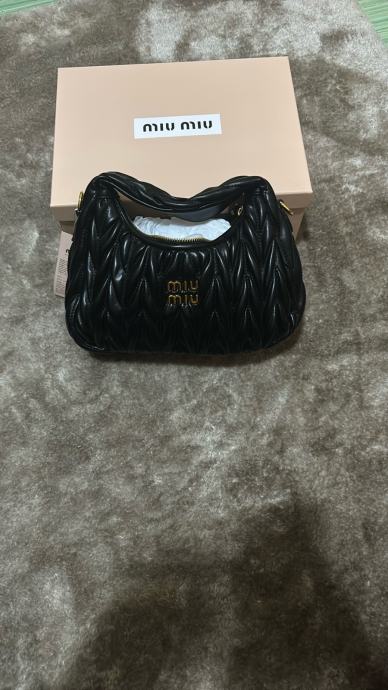 Prodajem crnu Miu Miu torbicu s prepoznatljivim matelasse uzorkom - karakterističnim nabiranim dizajnom. Torbica je u crnoj boji s laganim sjajem, elegantnog hobo oblika s dvije kratke ručke za nošenje. Na prednjoj strani je zlatni logotip brenda.