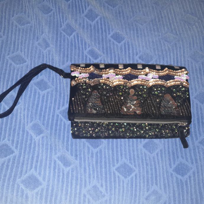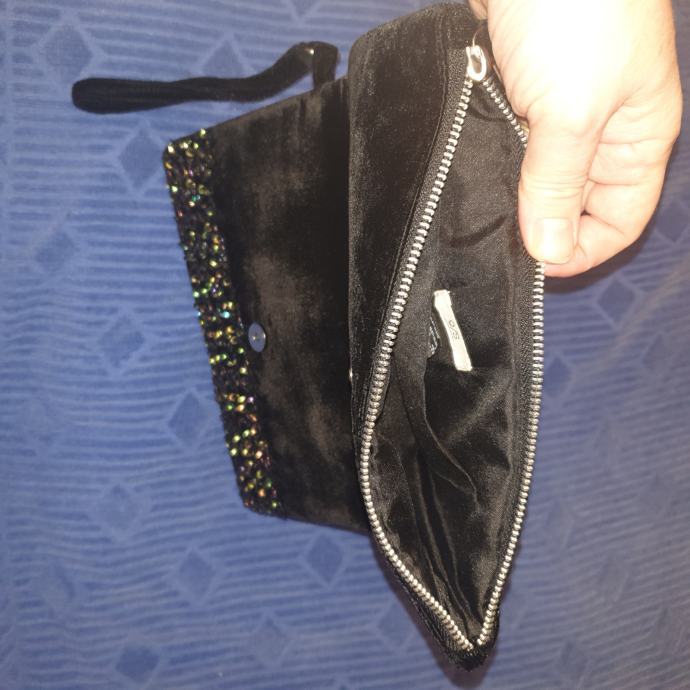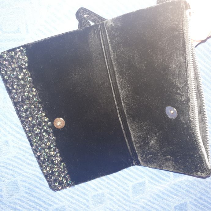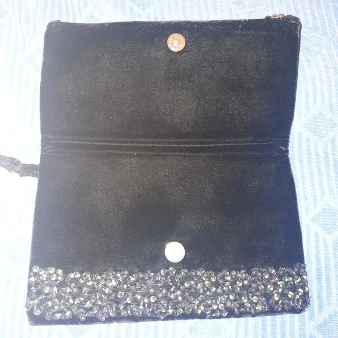 Prodajem novu svečanu crnu plišanu torbicu sa šljokicama dobivenu za rođendan ali nije moj stil pa je prodajem.Efektna i praktična za nošenje.7€
