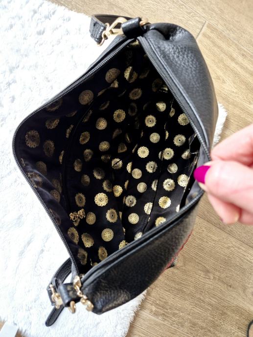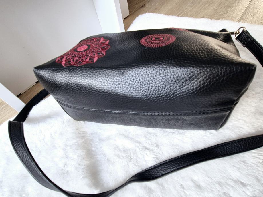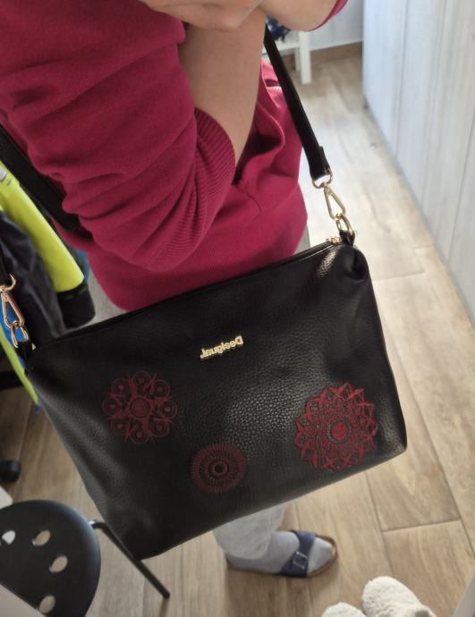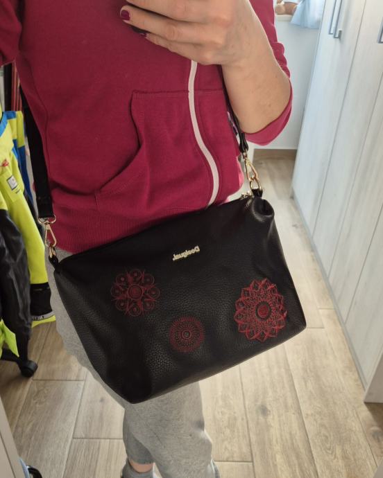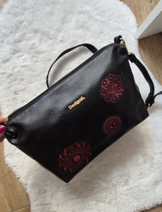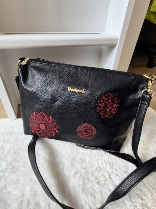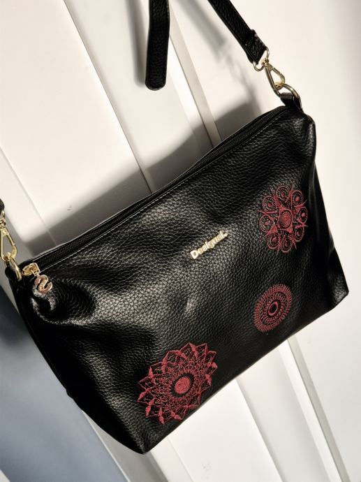 Desigual crna crossbody torbica sa bordo izvezenim ornamentima i zlatnim metalnim detaljima.