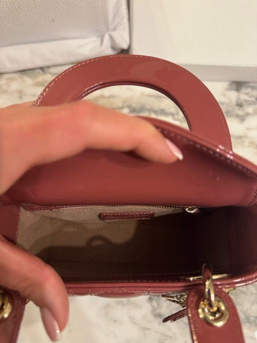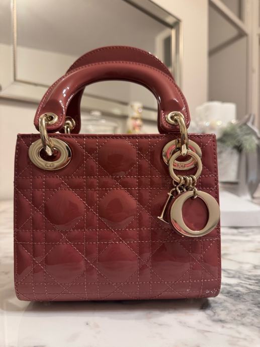 Dior Mini Lady od lakirane kože u boji koralja.Dimenzije 17x15x7cm (duljinaxvisinaxsirina) lanac,remen,dust bag,papiri,novo.