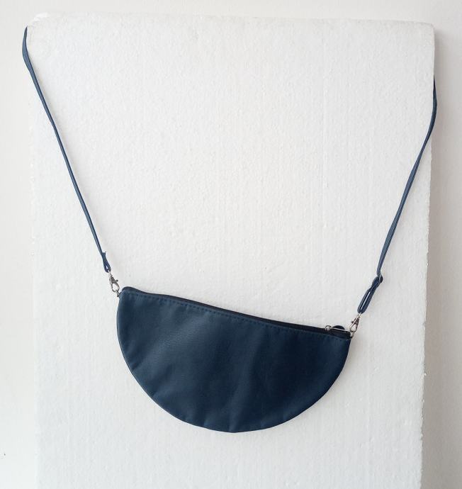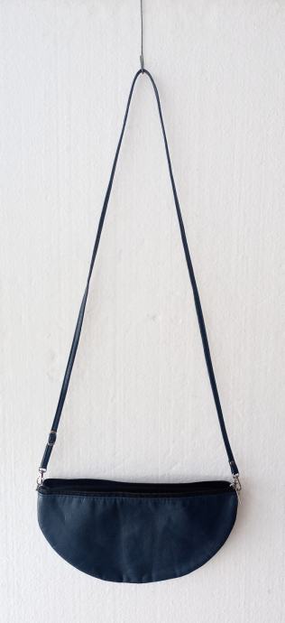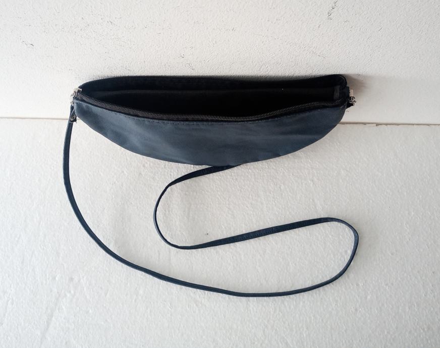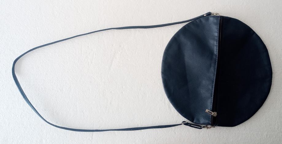 Plava torbica od dva polukruga, sa zatvaračem u sredini punog kruga. Dimenzije u preklopljenoj verziji su 30×15 cm. Puna duljina remena koji se može adaptirati je 120 cm. Može se nositi i u kružnom obliku, ako se optereti. Izrađena od imitacije kože. Nije korištena.