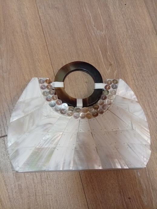 Prodajem unikatnu žensku torbicu izrađenu od prirodnih školjki (sedef / mother-of-pearl) u kombinaciji s dekorativnim perlama. Torbica ima čvrstu konstrukciju i atraktivnu okruglu ručku u imitaciji kornjačevine, što joj daje poseban, elegantan izgled.