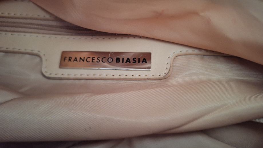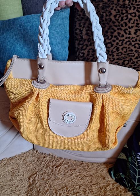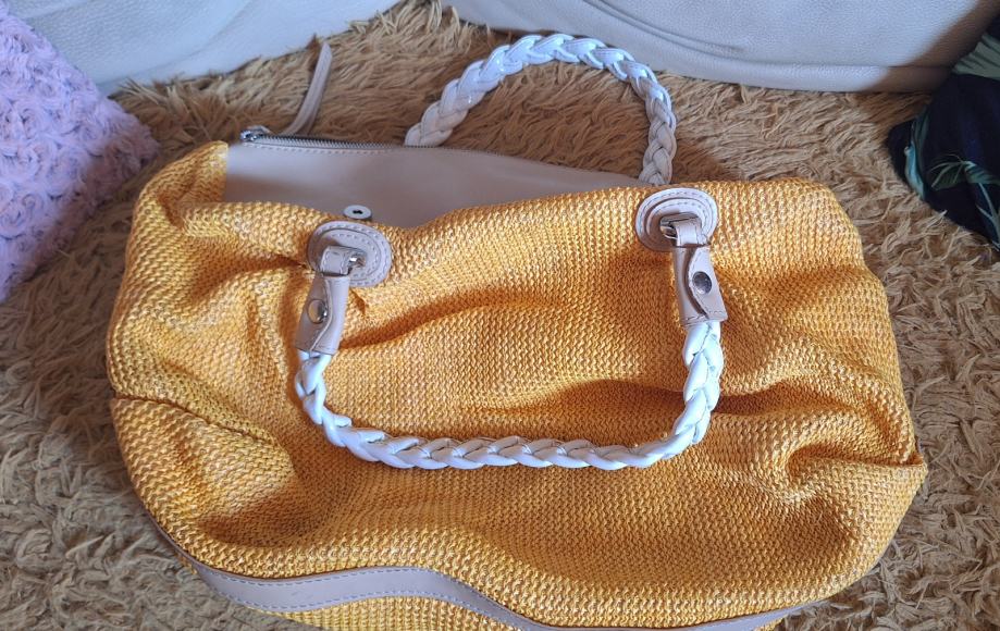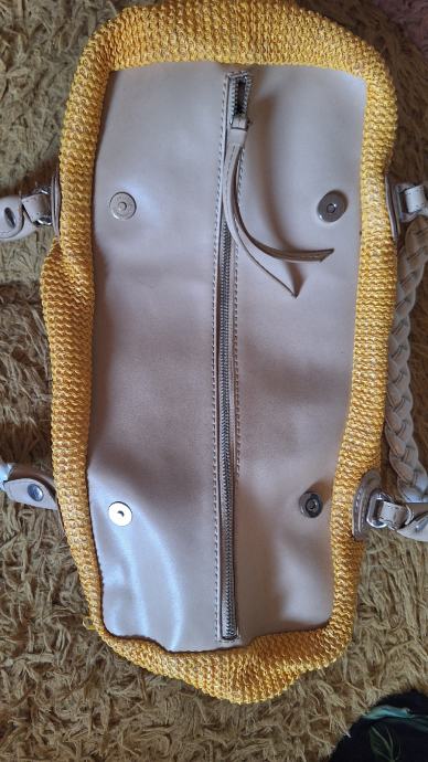 Dvostruka pletena ručka od sjajne eko kože, zatvaranje patentnim zatvaračem. Prednji džep sa kopčom, dva unutarnja prorezana džepa. Unutarnja podstava poliester.