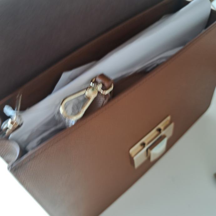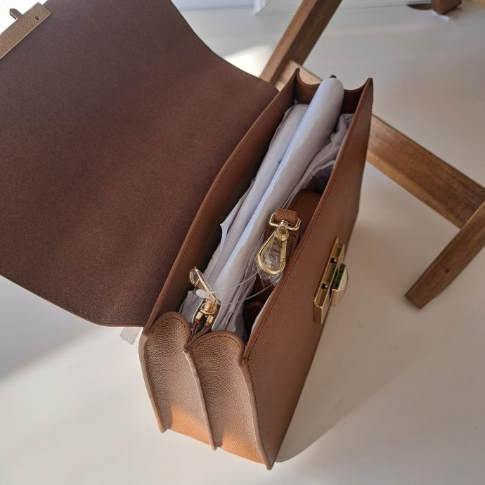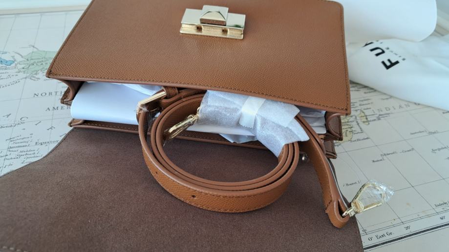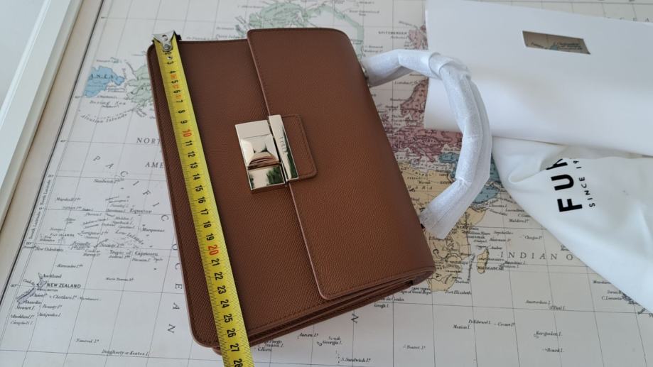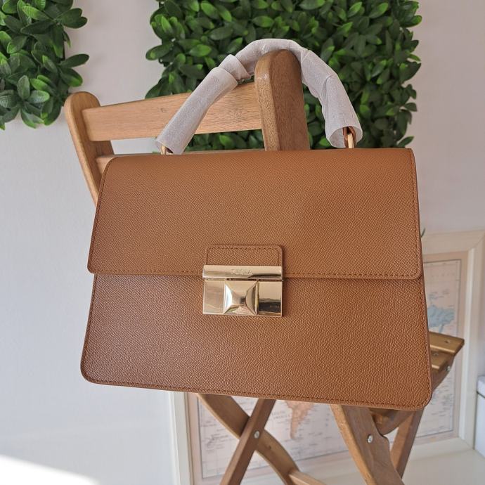 Savršena poslovna torba idealna i u službenim situacijama i za casual izdanje. Prava koža konjak smeđe boje. Nova ali bez etikete sa svim zaštitama i originalnoj papirnatoj vrećici u koju je bila zapakirana prilikom kupnje (šaljem i nju ako netko želi). Dolazi sa dust bag-om i karticom originalnosti. Najprodavaniji model torbi Furla Top handle midium/large. Boja uživo može malo odstupati od slika pa sam je pokušala slikati pod različitim osvjetljenima.