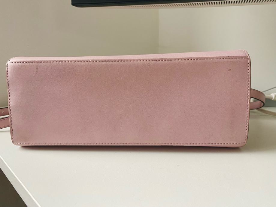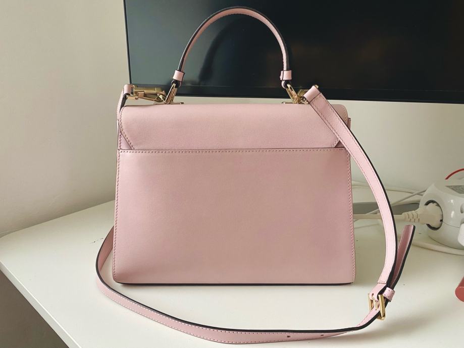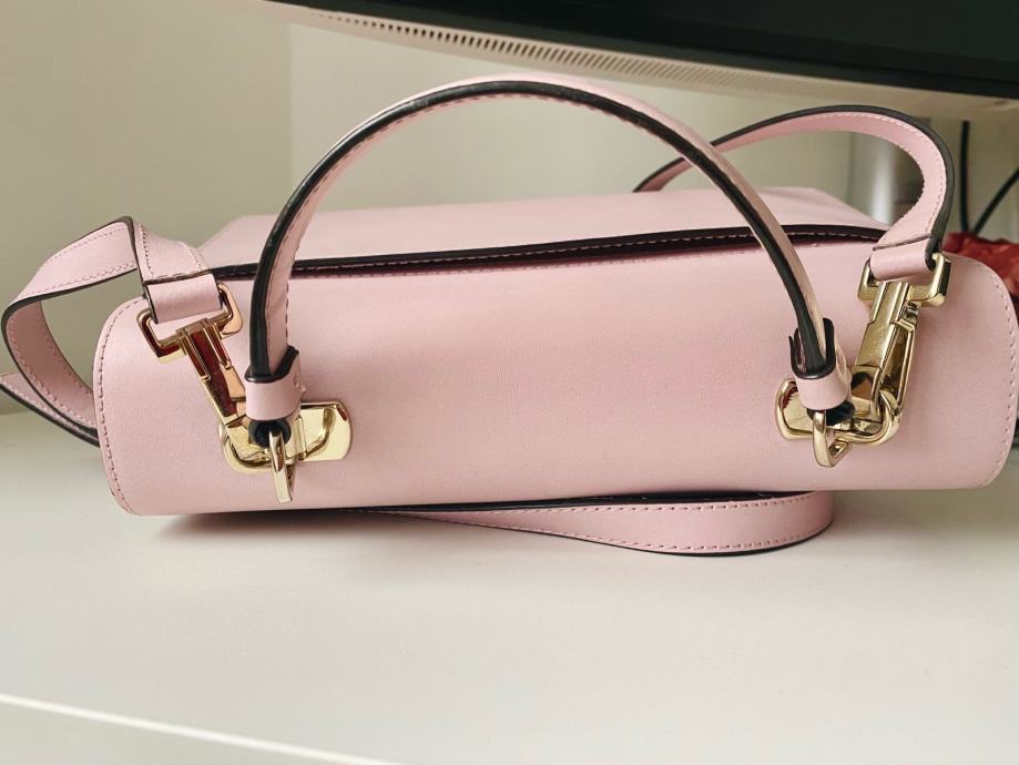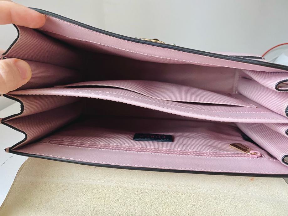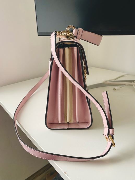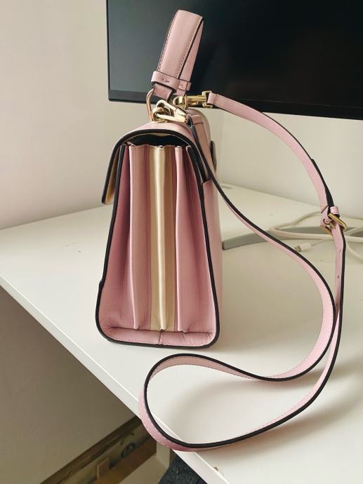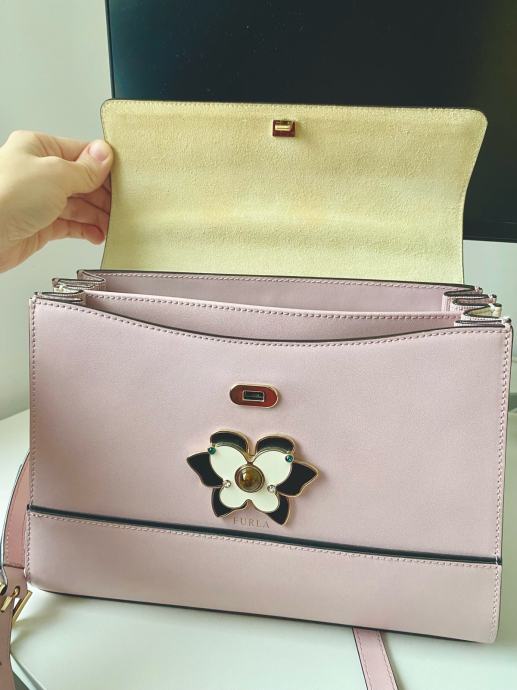 Elegantna Furla Mughetto torba s gornjom ručkom izrađena od glatke rumenkasto ružičaste kože. Ovaj strukturirani dizajn ima profinjenu gornju ručku i odvojivi, podesivi remen za rame, što omogućuje nošenje u ruci, na ramenu ili preko tijela. Prednji preklop završen je Furlinom prepoznatljivom cvjetnom kopčom na okretanje od emajla i zlatnih metalnih dijelova. Kompaktna, ali funkcionalna, unutrašnjost je dobro organizirana i idealna za svakodnevne potrepštine.