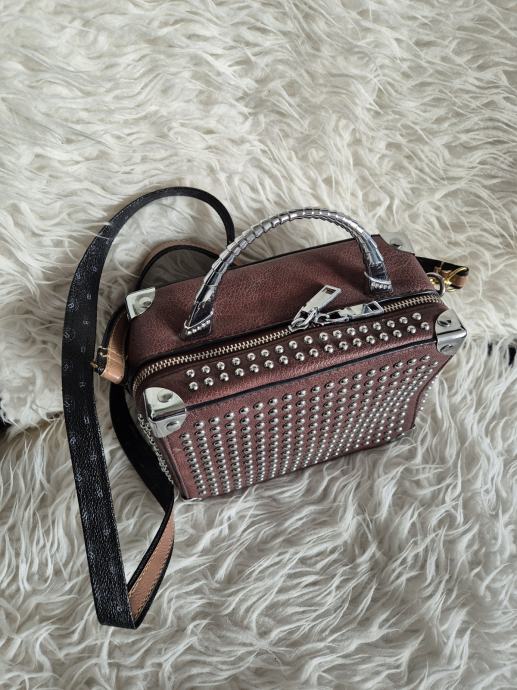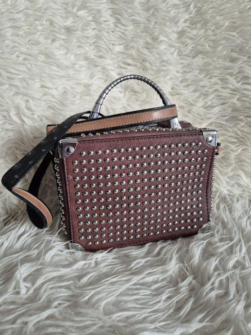 Prekrasna smeda torba sa zakovicama, u koju dosta toga stane, izgledom kao kofercic, produljivi remen. Dimenzije 20x15x9cm.