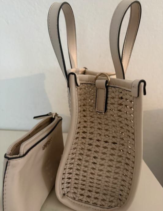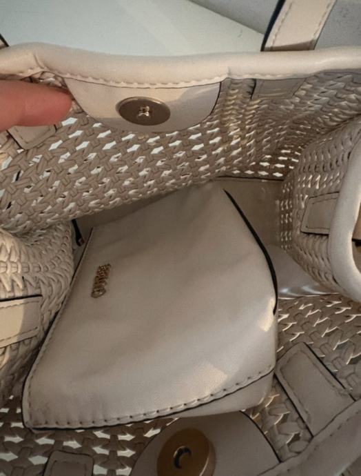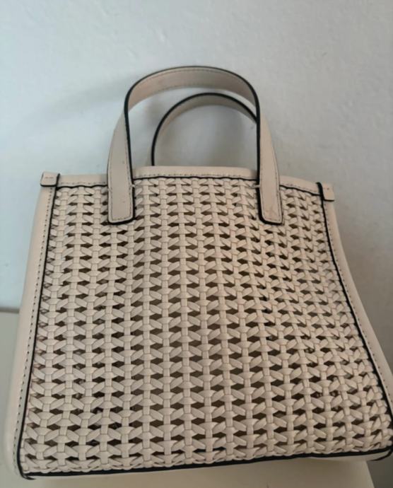 Prodajem Guess torbicu u bijeloj boji. Torbica ima prekrasan perforiran uzorak na prednjoj i stražnjoj strani, što joj daje moderan i elegantan izgled. Dolazi s dva remena - kraći za nošenje u ruci i duži, podesivi remen za nošenje preko ramena ili unakrsno. Guess logo je vidljiv na prednjoj strani torbice. Unutra ima dovoljno prostora za sve osnovne stvari.