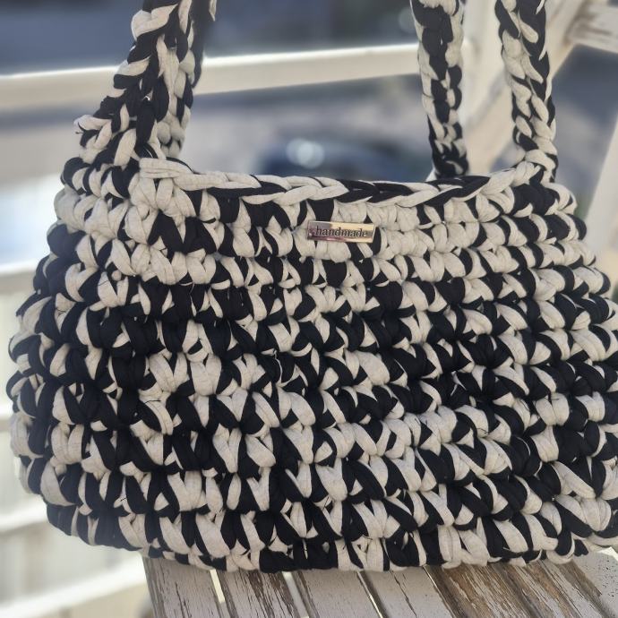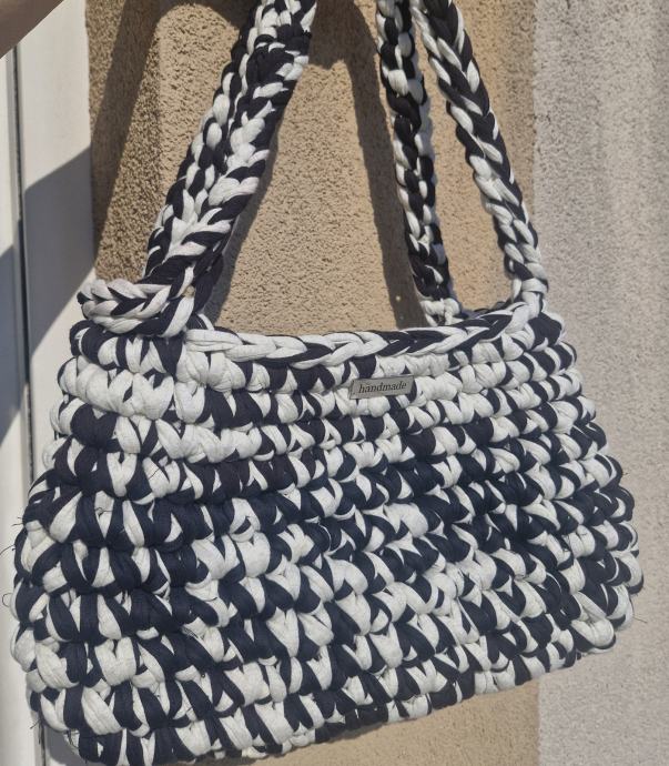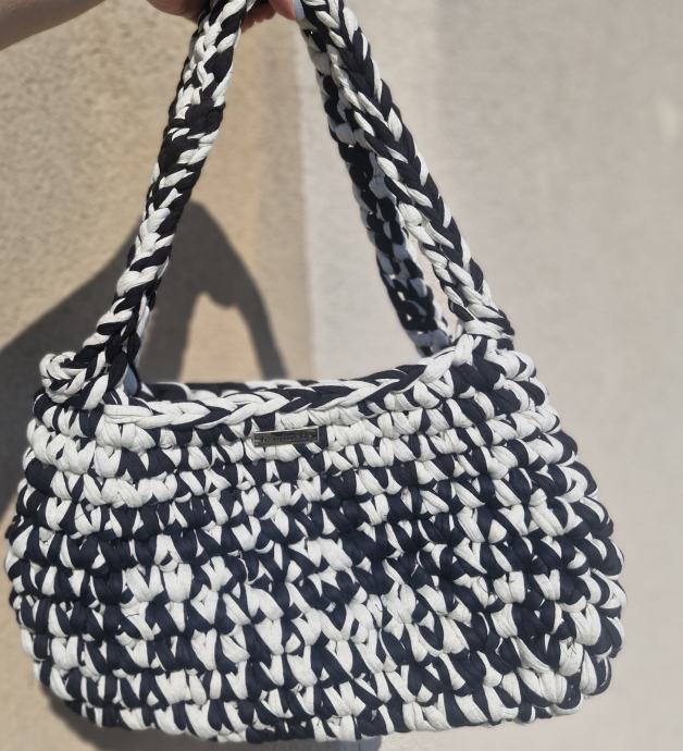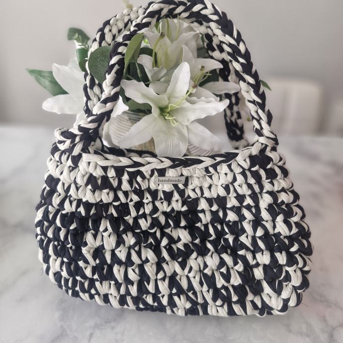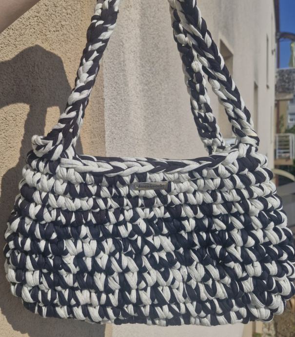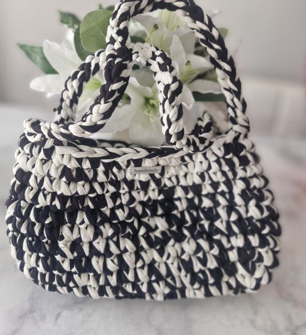 Prodajem novu heklanu torbicu ručne izrade u kombinaciji crne i bijele boje. Torba je izrađena od deblje pletene tkanine, a ručka je oblikovana kao pletenica što daje lijep detalj cijelom komadu. Kompaktnog je oblika, dovoljno prostrana za svakodnevne stvari. Na prednjoj strani nalazi se mali metalni detalj.