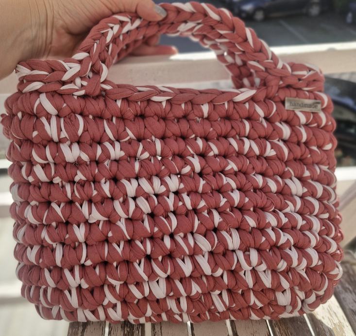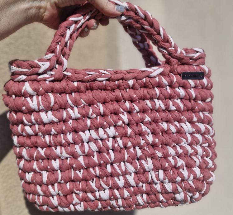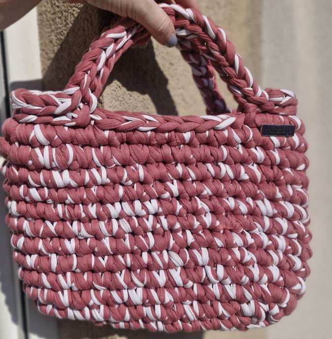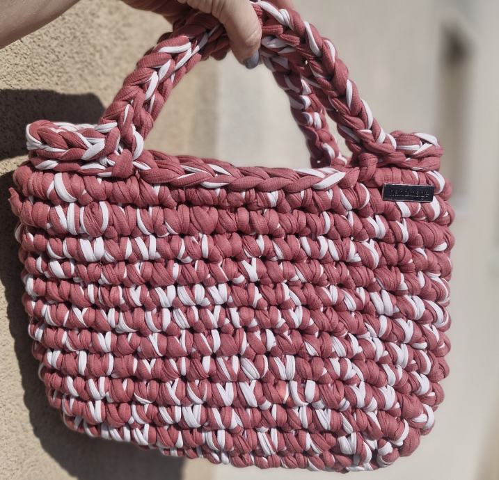 Prodajem novu heklanu torbicu s etiketom, ručne izrade (handmade). Radi se o čvrstoj, strukturiranoj torbici pravokutnog oblika u kombinaciji staro ružičaste i bijele boje. Ručka je pletena i dovoljno velika da se nosi u ruci ili na podlaktici. Izrada je precizna i kvalitetna, s gustim heklanjem koje torbici daje volumen i stabilnost.
