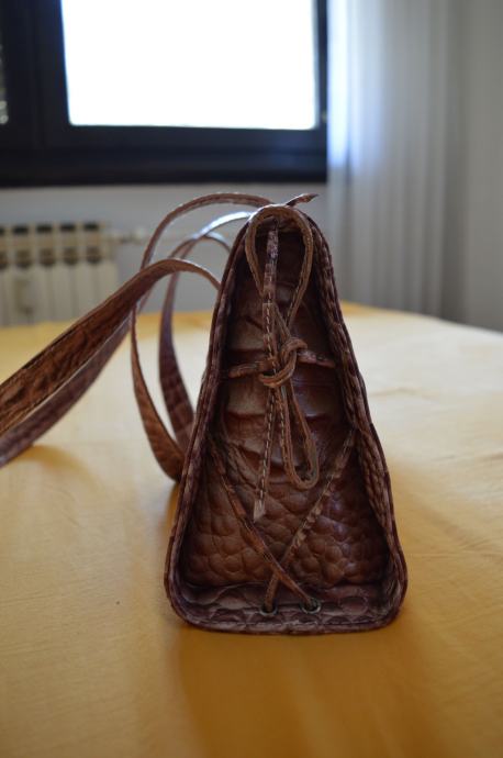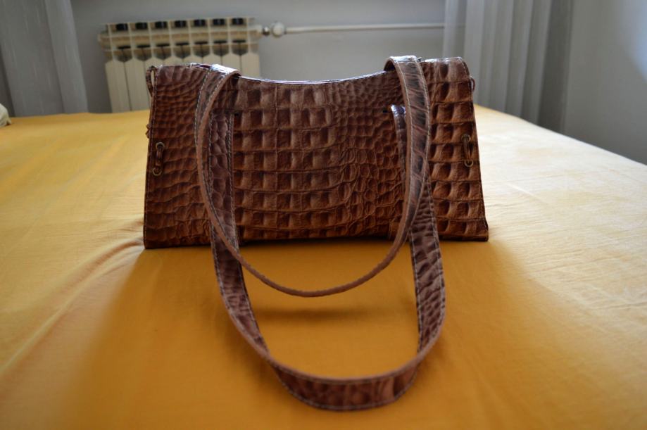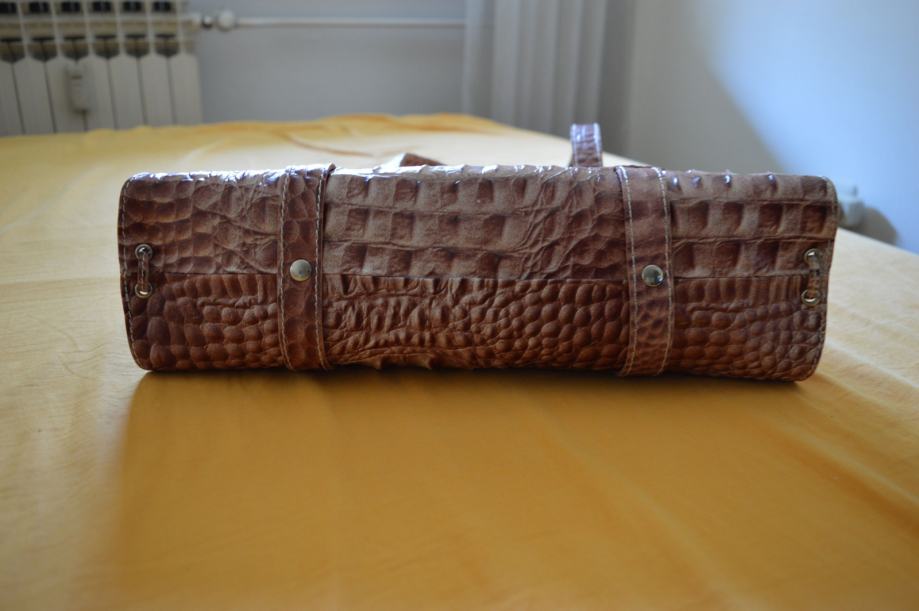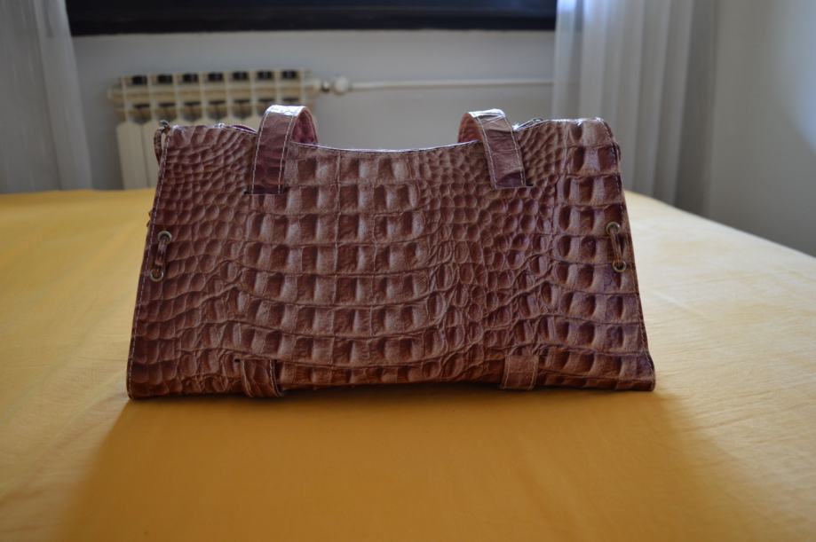 Nošena par puta bez tragova korištenja. Prava koža mislim kravlja(zato što nigdje ne piše čija) ali dizajn krokodilske kože. Proizvedeno u Italiji. Tamnija roza sa tamnijim i svijetlijim dijelovima. Unutra je jedan manji džepić jedan pretinac na cif. Dimencija cca : visina bez ručki 18 cm, sa ručkama 45 cm, dužina 35 cm, širina dna 10 cm. Čvrsta, kompaktna, kvalitetna.