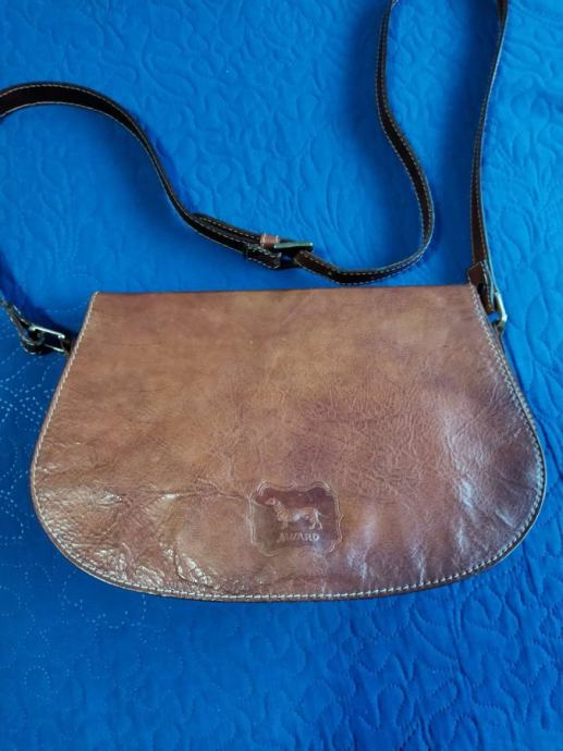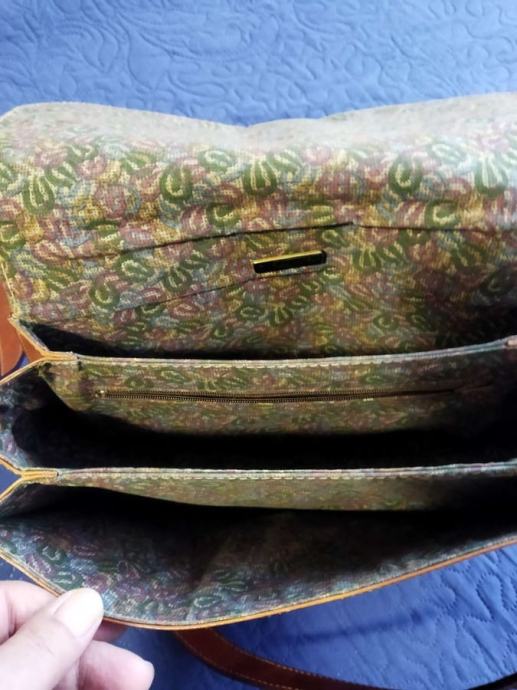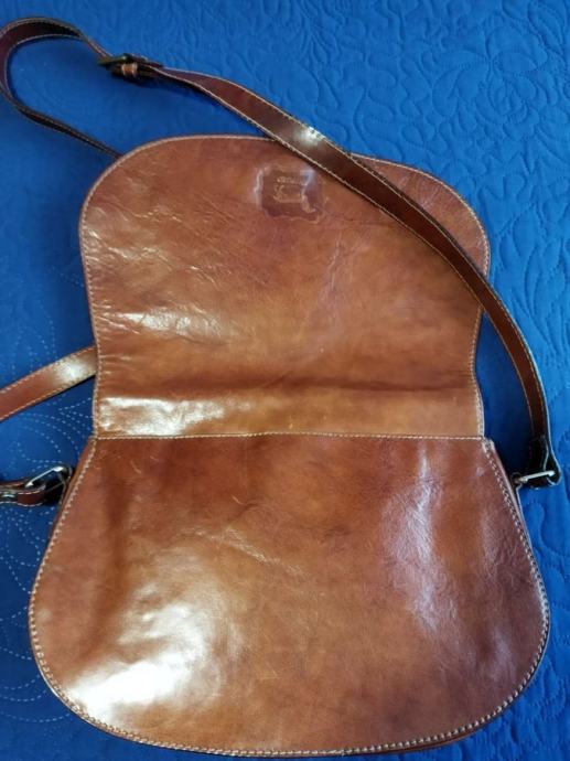 Kozna torba lijepe konjak boje, torba i podstava kao nova, tri pretinca, na preklop, dim.30x20, podesiv dugačak remen za na rame dužine 140cm